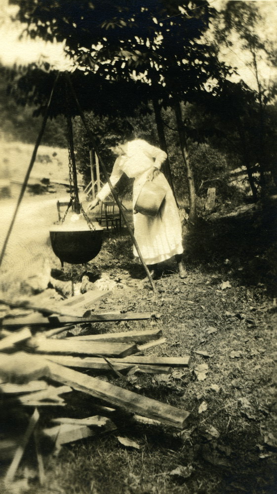 lave_011 Mrs. Fagg by the “kittle” at O.L.H. [Old Log House]. lave011.jpg (202640 bytes)