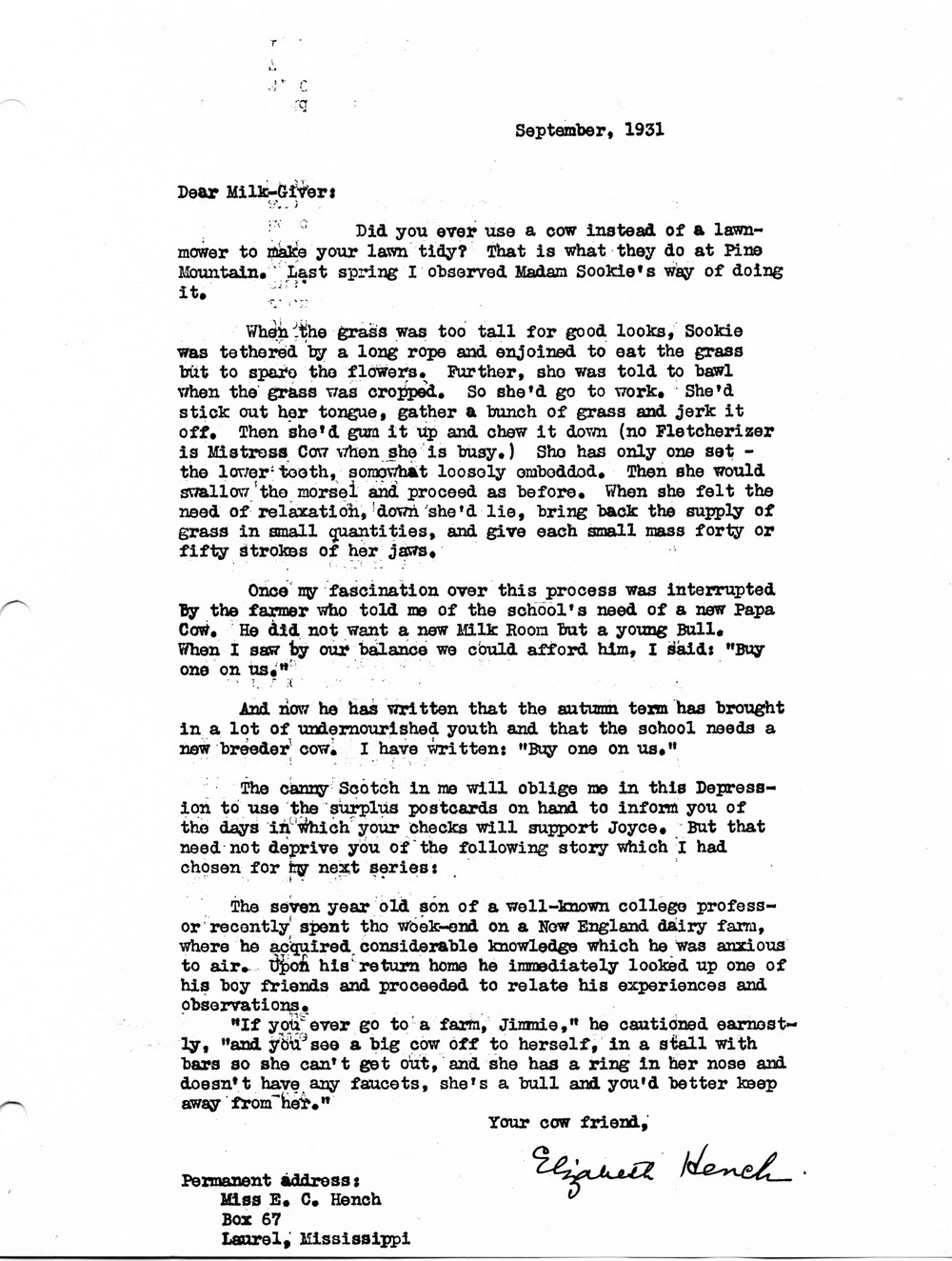 Elizabeth Hench – “The Cow Letters” 1931