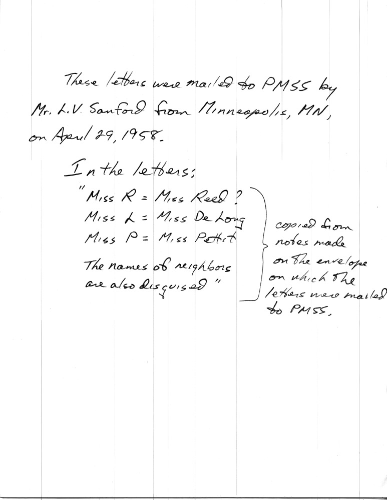 A second short letter from Mr. Sanford arrived on June 3, 1958, accompanied by photographs taken by Catherine Rittenhouse and possibly other staff. He describes the second donation: