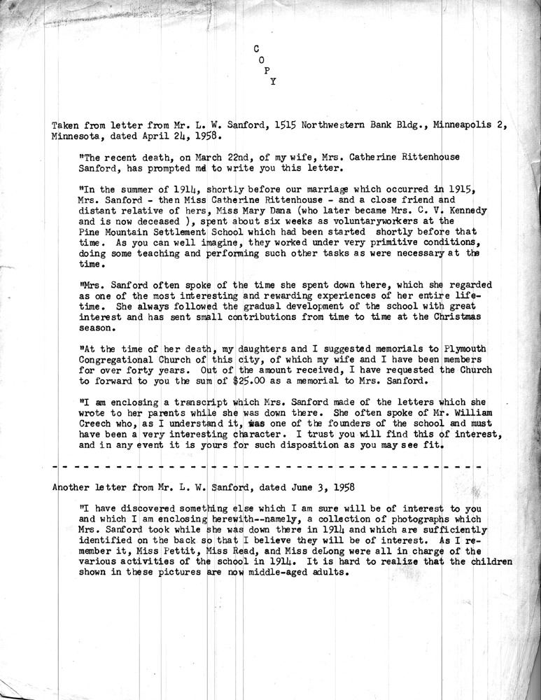 Catherine Rittenhouse ; Catherine Rittenhouse Sanford ; Pine Mountain Settlement School ; education ; Mary Dana ; volunteers ; L.V. Sanford ; Dora Reed Goodale ; Ethel De Long ; Miss R ; Miss L ; Mrs. C.V. Kennedy ; Plymouth Congregational Church ; memorials ; William Creech ; photographs ; donations ; Katherine Pettit ; |