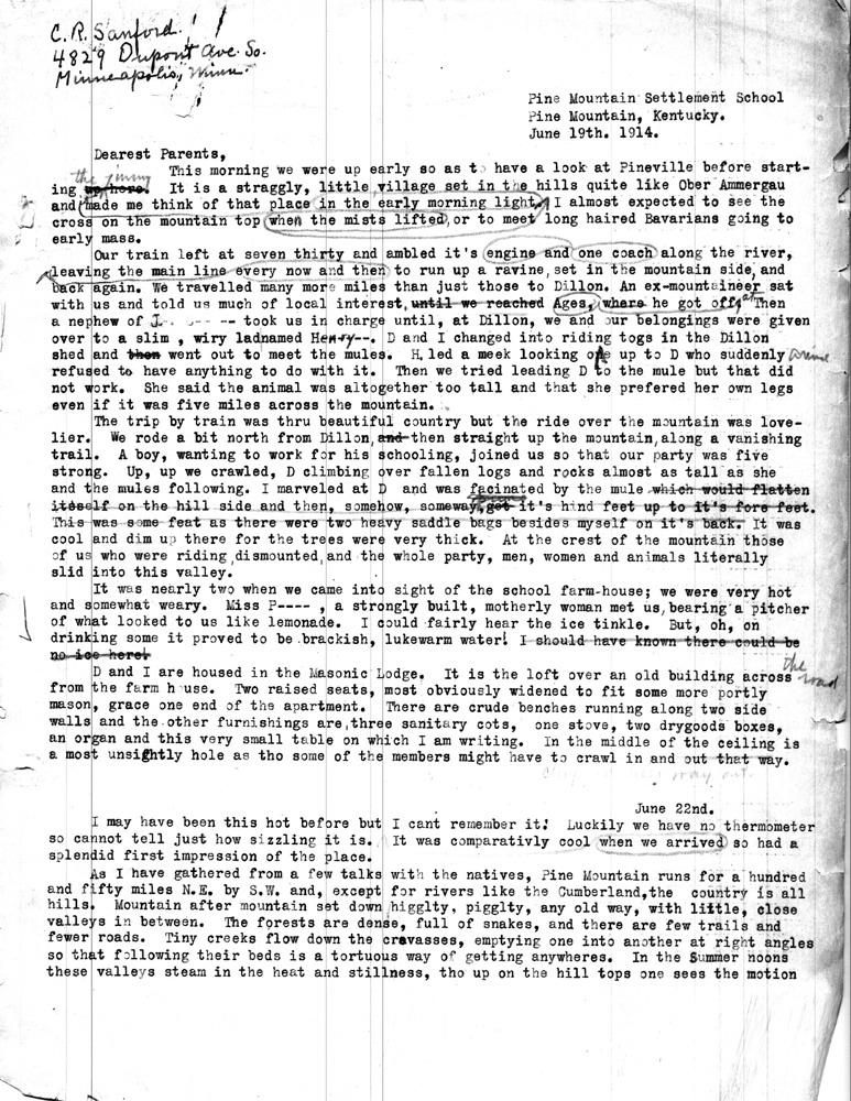 In the summer of 1914, shortly before our marriage which occurred in 1915, Mrs. Sanford — then Miss Catherine Rittenhouse — and a close friend and distant relative of hers, Miss Mary Dana (who later became Mrs. C.V. Kennedy and is now deceased) spent about six weeks as voluntary workers at the Pine Mountain Settlement School which had been started shortly before that time. As you can well imagine, they worked under very primitive conditions doing some teaching and performing such other tasks as were necessary at the time.