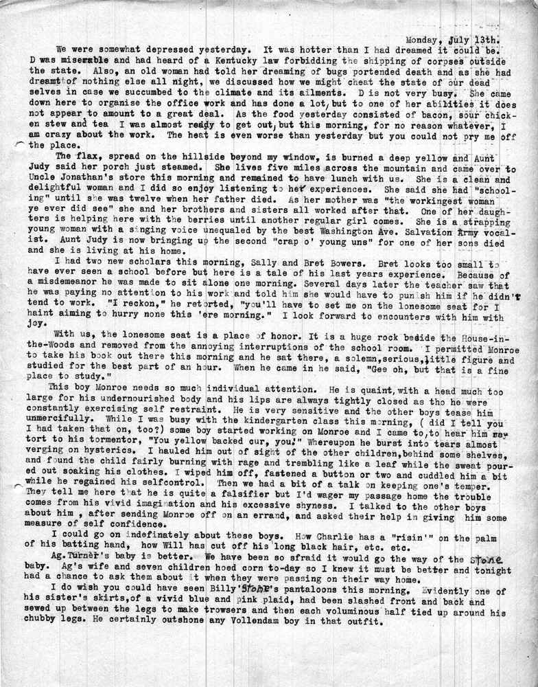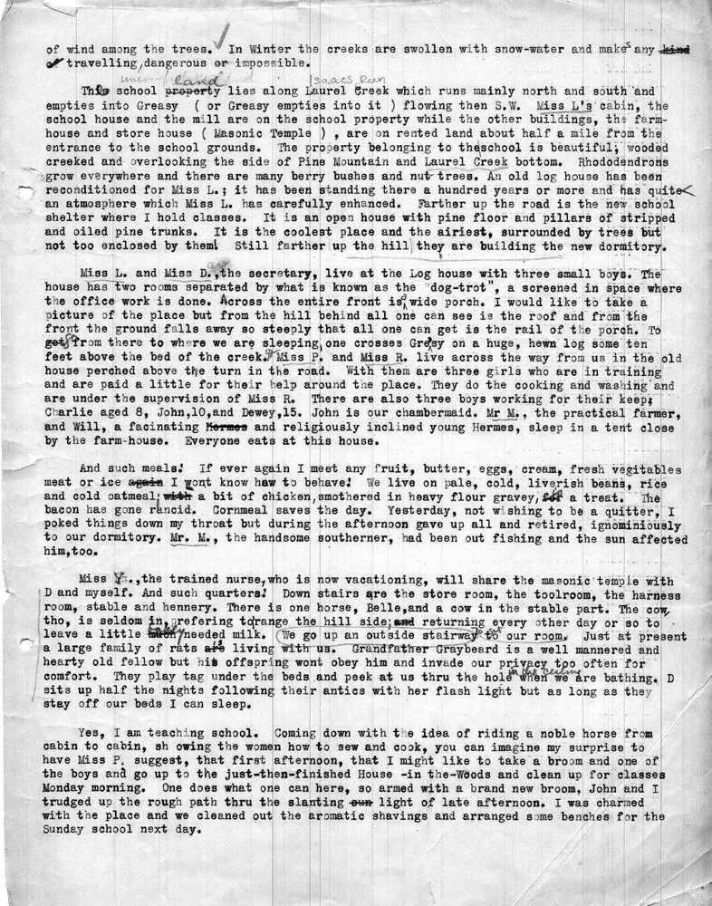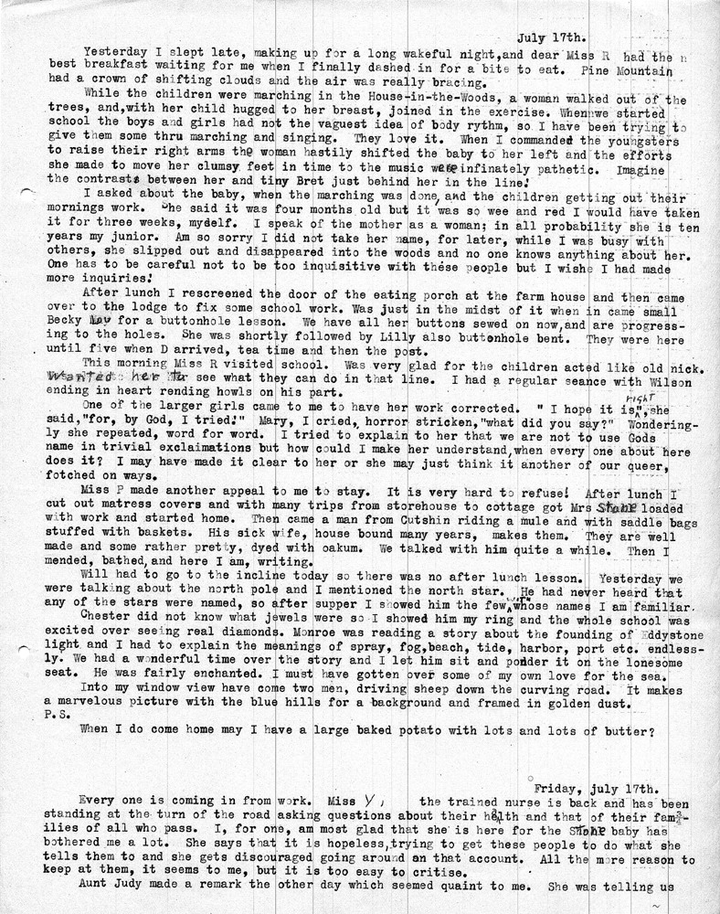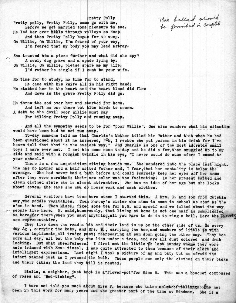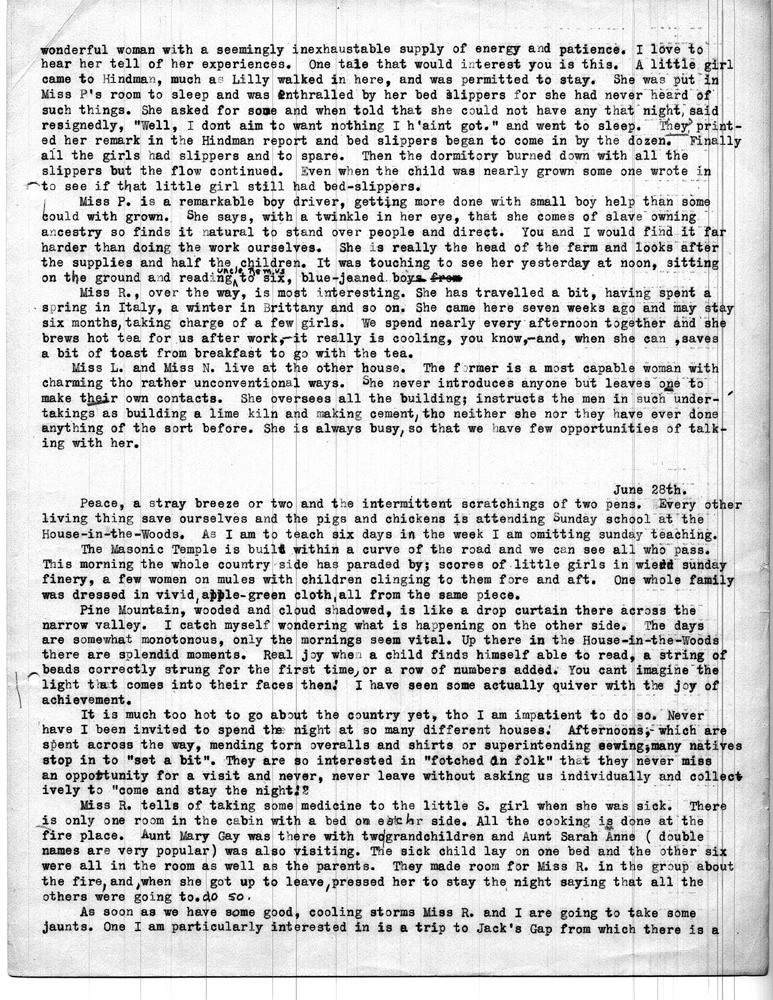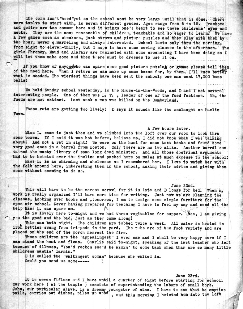 Note: As was common among workers at Pine Mountain, individuals at the school and community members were either referred to by a simple letter, i.e. “Miss R” (Dora Hill Reed Goodale), “Miss L” (Ethel De Long), etc. Or, names were disguised, as was the case with the names of community folk. A cryptic guide to personal identification was included on the envelope that was used to mail the Rittenhouse letters to the school. The images and letters were accompanied by a letter from Mr. Sanford who describes his wife and her years at the school.