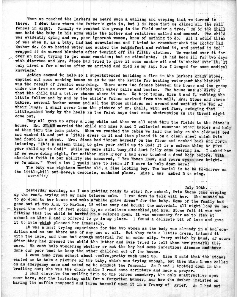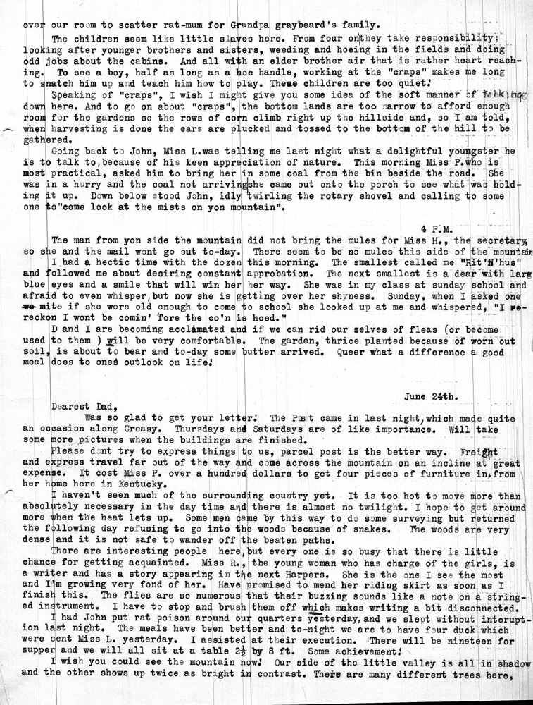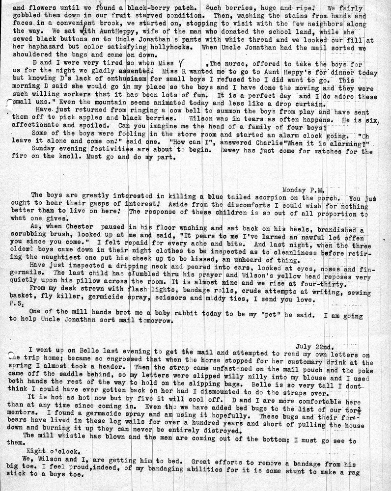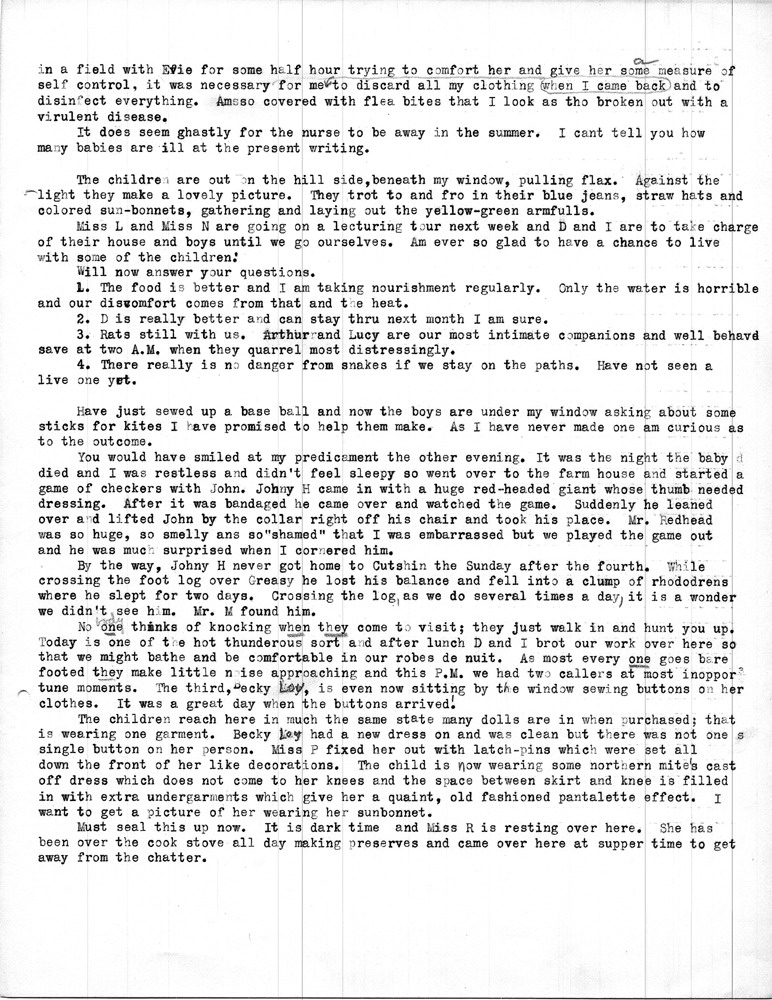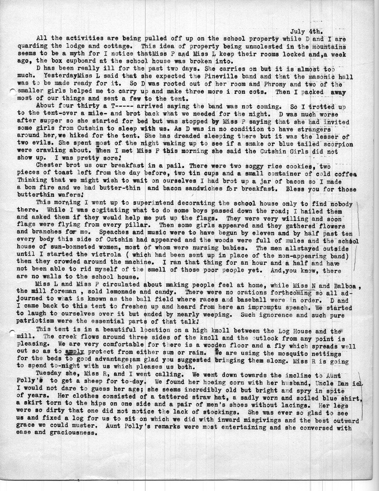 Note: As was common among workers at Pine Mountain, individuals at the school and community members were either referred to by a simple letter, i.e. “Miss R” (Dora Hill Reed Goodale), “Miss L” (Ethel De Long), etc. Or, names were disguised, as was the case with the names of community folk. A cryptic guide to personal identification was included on the envelope that was used to mail the Rittenhouse letters to the school. The images and letters were accompanied by a letter from Mr. Sanford who describes his wife and her years at the school.