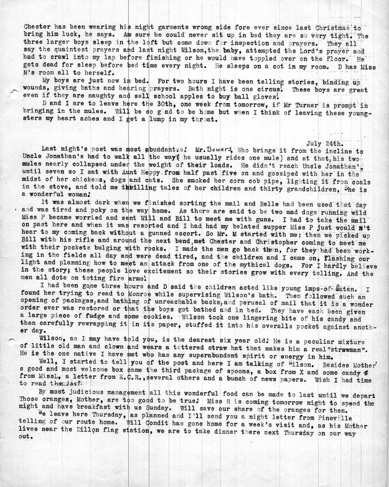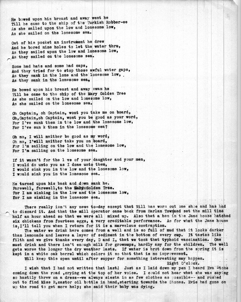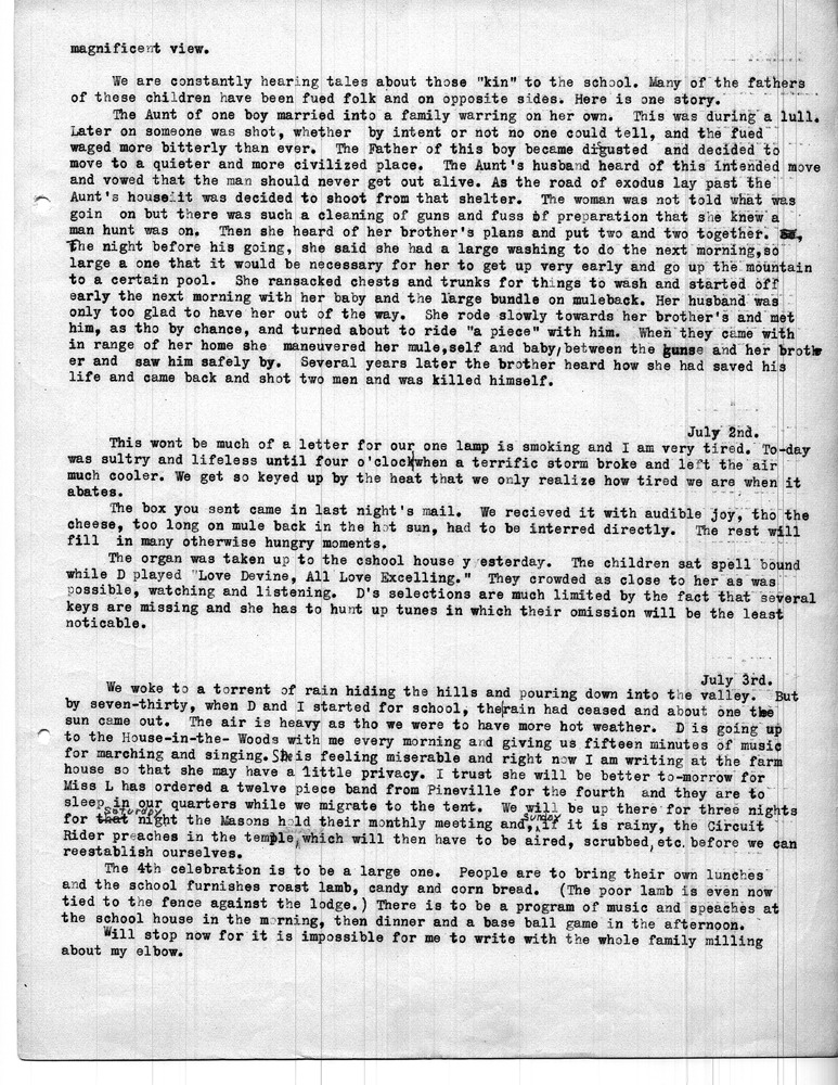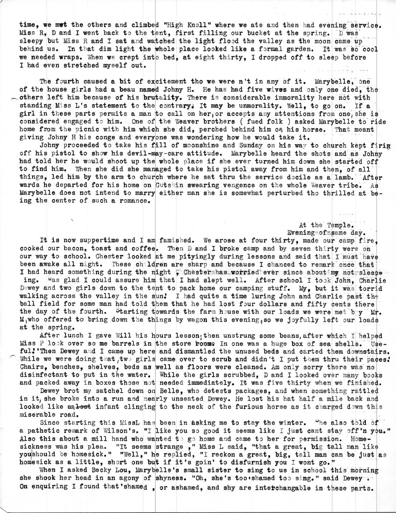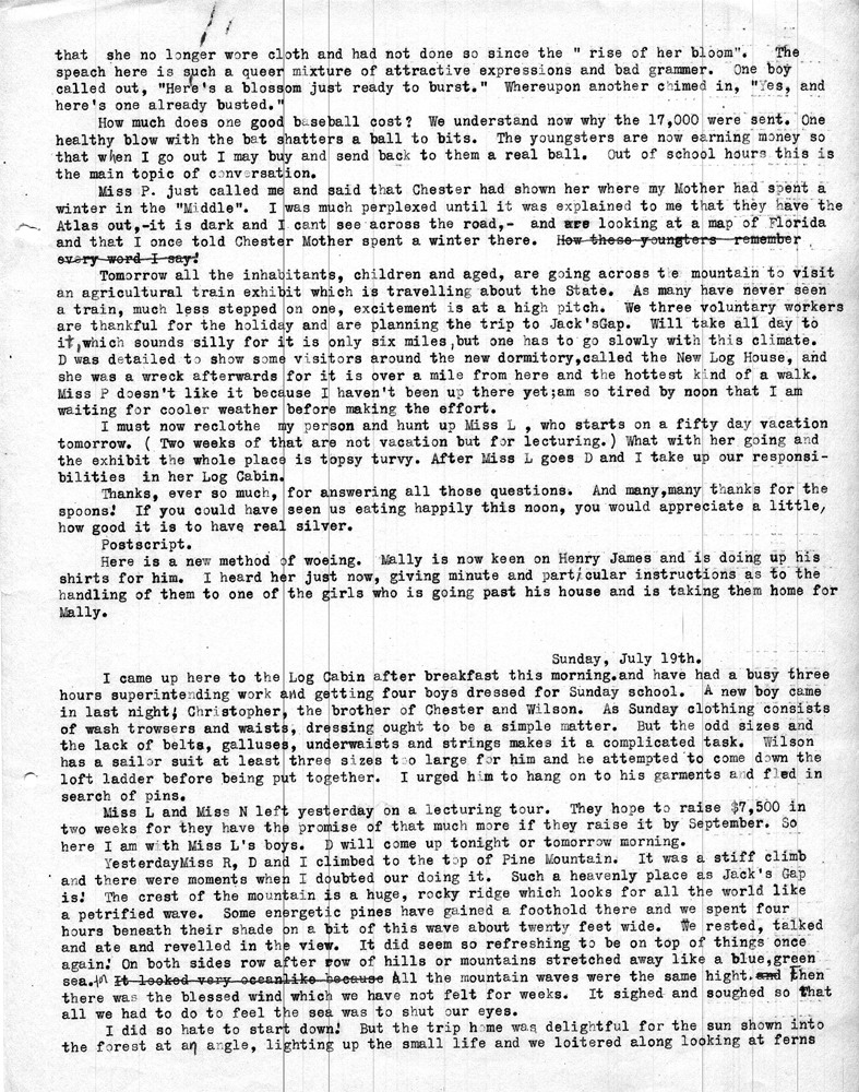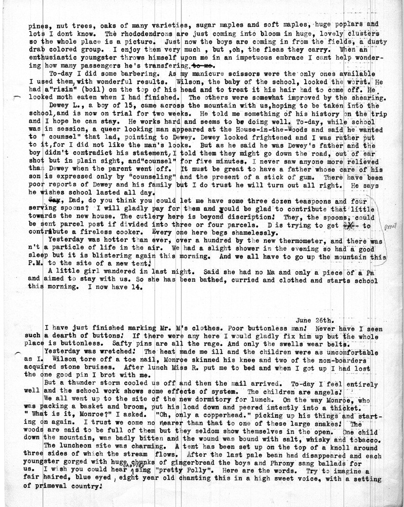 Note: As was common among workers at Pine Mountain, individuals at the school and community members were either referred to by a simple letter, i.e. “Miss R” (Dora Hill Reed Goodale), “Miss L” (Ethel De Long), etc. Or, names were disguised, as was the case with the names of community folk. A cryptic guide to personal identification was included on the envelope that was used to mail the Rittenhouse letters to the school. The images and letters were accompanied by a letter from Mr. Sanford who describes his wife and her years at the school.