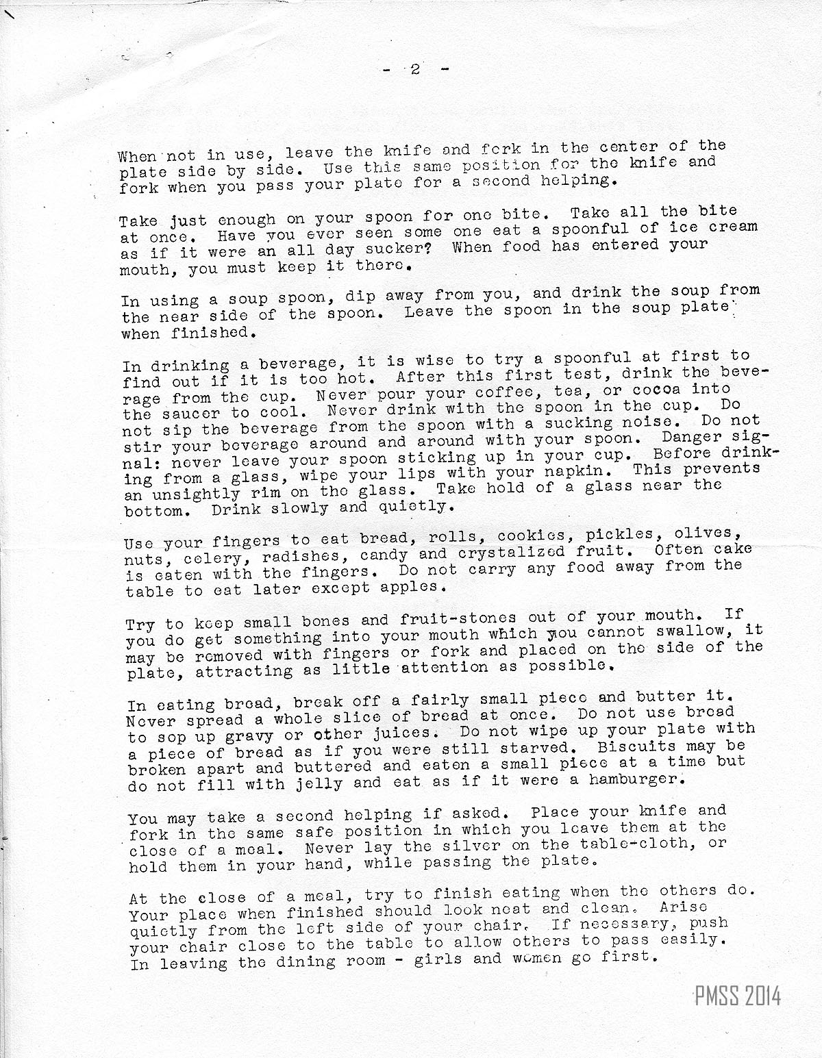 While Birdena Bishop was dietitian at Pine Mountain Settlement School she continued the education of proper etiquette in the dining room. The following rules for etiquette and for those students who were charged with waiting tables are described in two publications produced in the late 1940s.