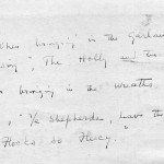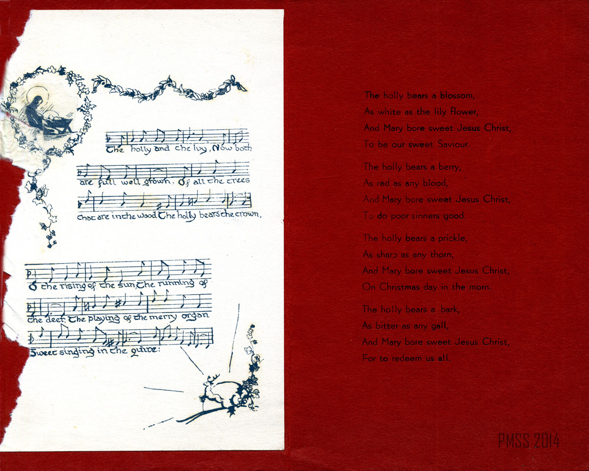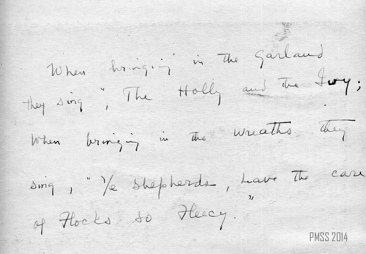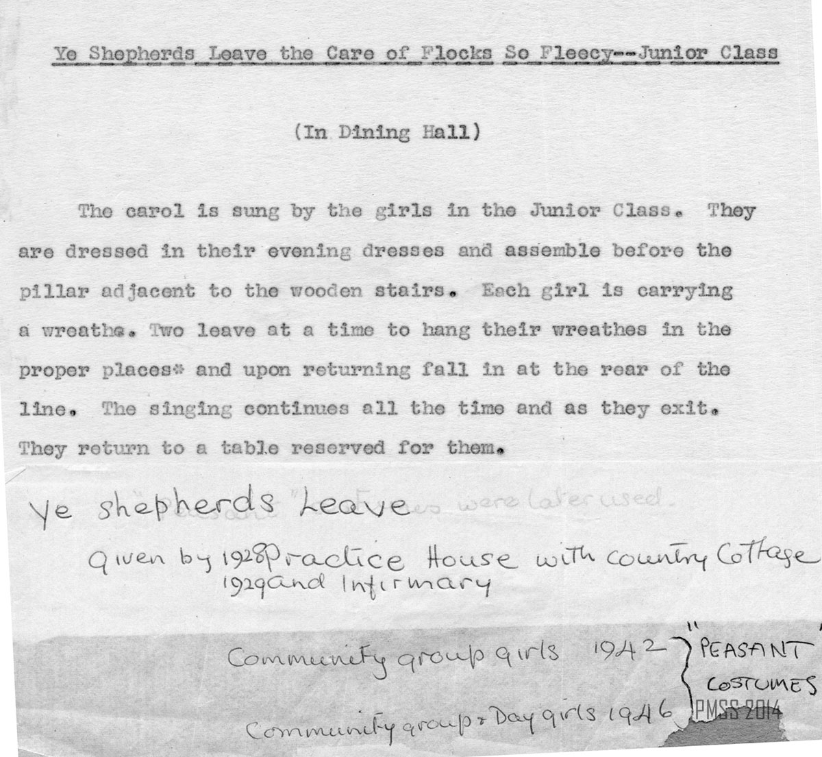Following the MUMMER’S PLAY, a carol is sung by girls representing the Junior Class at the School. The carol, “Ye Shepherds Leave the Care of Flocks So Fleecy,” and the ritual is described as follows: