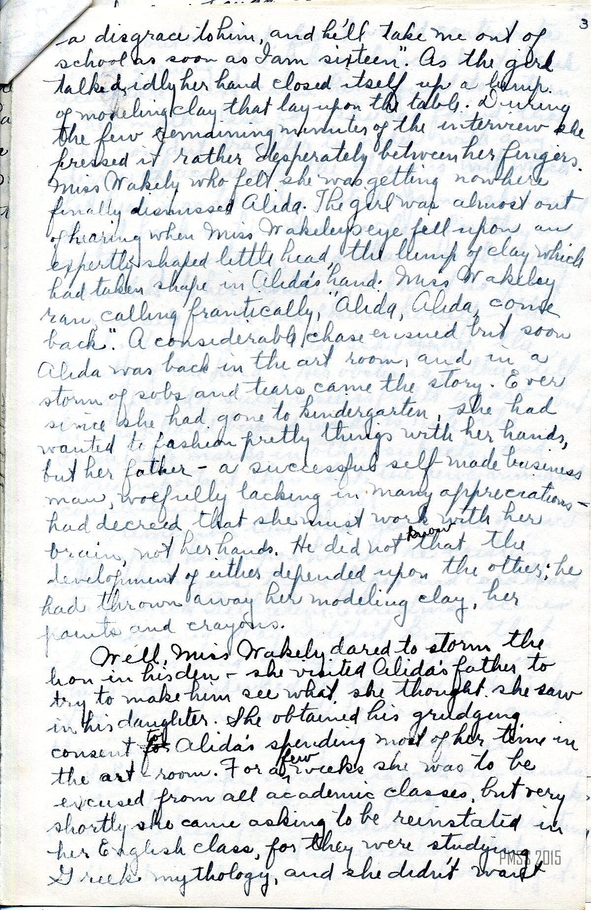 …a disgrace to him, and he’ll take me out of school as soon as I am sixteen.” As the girl talked, idly her hand closed itself up a lump of modeling clay that lay upon the table. During the few remaining minutes of the interview she pressed it rather desperately between her fingers. Miss Wakely, who felt she was getting nowhere finally dismissed Alida. The girl was almost out of hearing when Miss Wakely’s eye fell up an expertly shaped little head, the lump of clay which had taken shape in Alida’s hand. Miss Wakely ran calling frantically, “Alida, Alida, come back”. A considerable chase ensued but soon Alida was back in the art room, and in a storm of sobs and tears came the story. Ever since she had gone to kindergarten, she had wanted to fashion pretty things with her hands, but her father — a successful self-made business man, woefully lacking in many appreciations — had decreed that she must work with her brain, not her hands. he did not know that the development of either depended upon the other; he had thrown away her modeling clay, her paints and crayons.