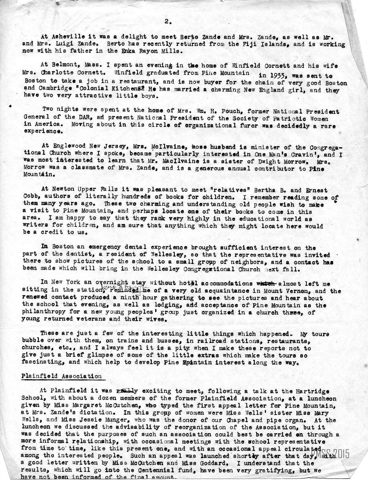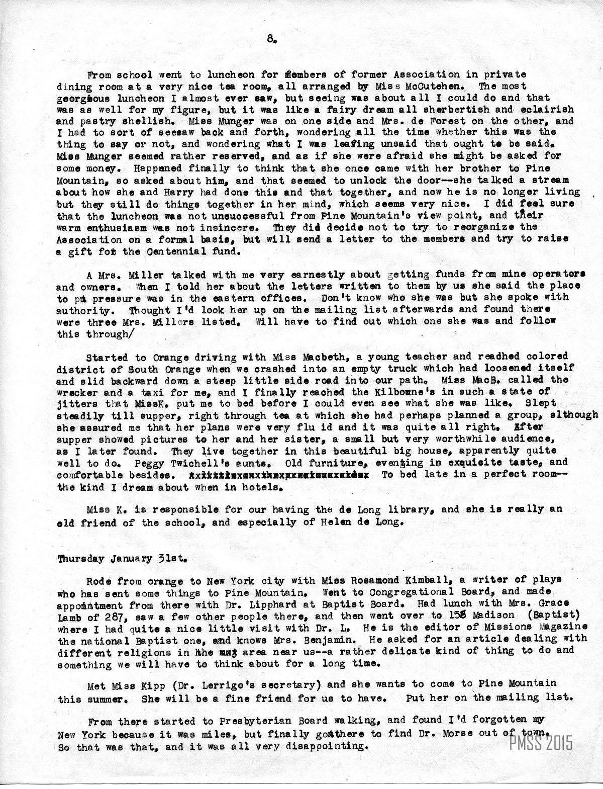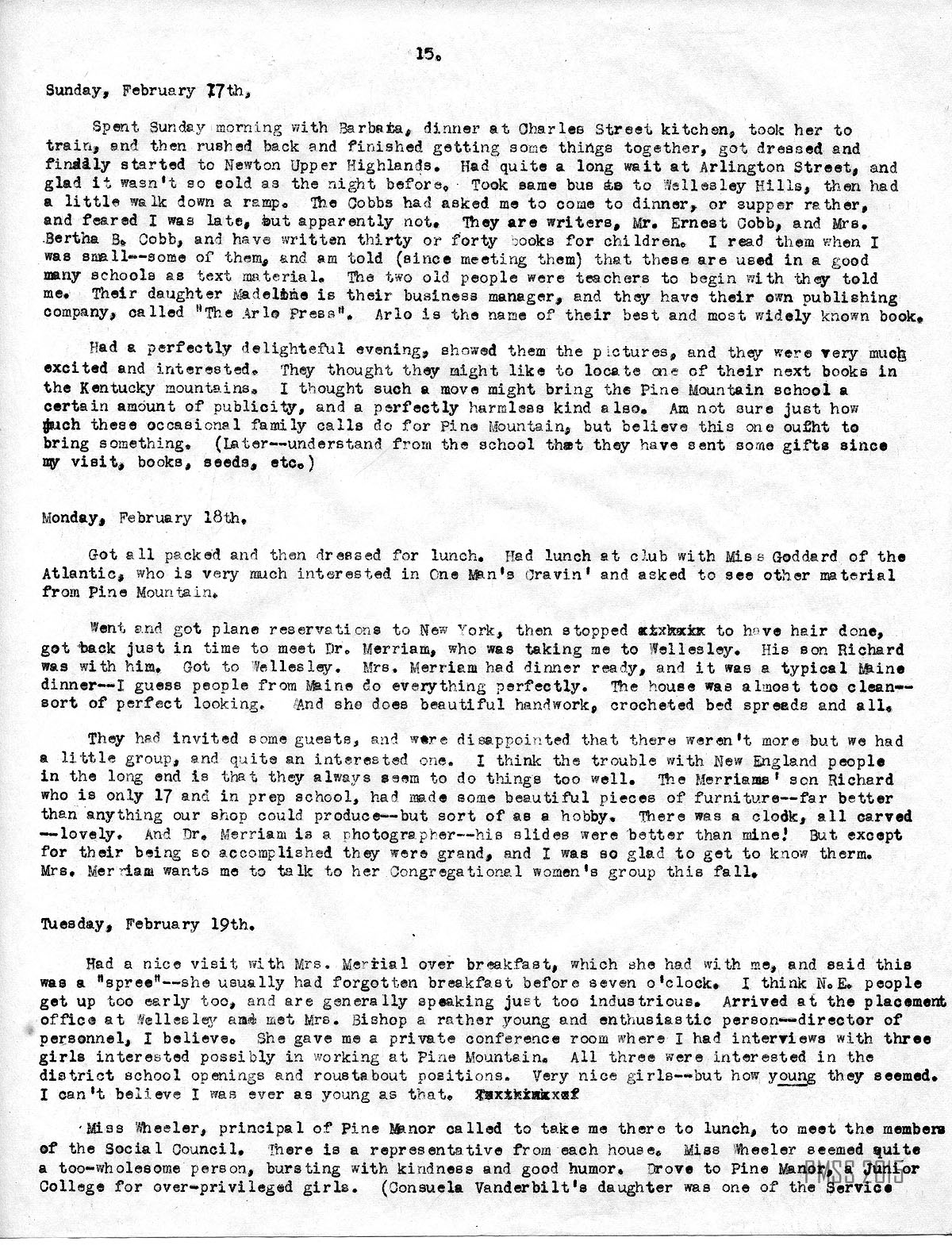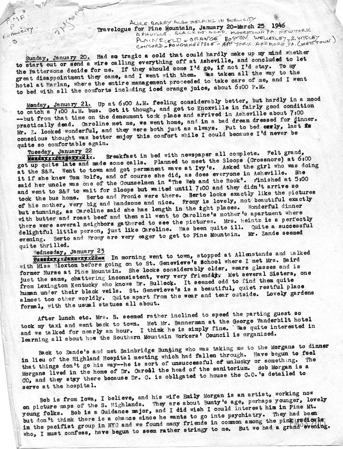 She starts her fundraising in the midst of the flu or a very bad cold in Asheville, NC, where she is re-connected with the new Luigi Zande family, formerly of Pine Mountain, and takes several days to recover from her illness. She is then on to Black Mountain College [Academy] where she finds the program and the students confounding. Then by train she travels to Moorestown, PA, on to New York City, NY, to Plainfield and Orange, NJ, and then to entertain the “Boston Brahmins.” Also in the Boston area she visits Wellesley College where former PMSS staff member, Evelyn K. Wells, is teaching and then on to S. Undley, Concord, and Poughkeepsie, NY. Her last stop is in More, PA (Westown), and then a return by train to Pine Mountain.