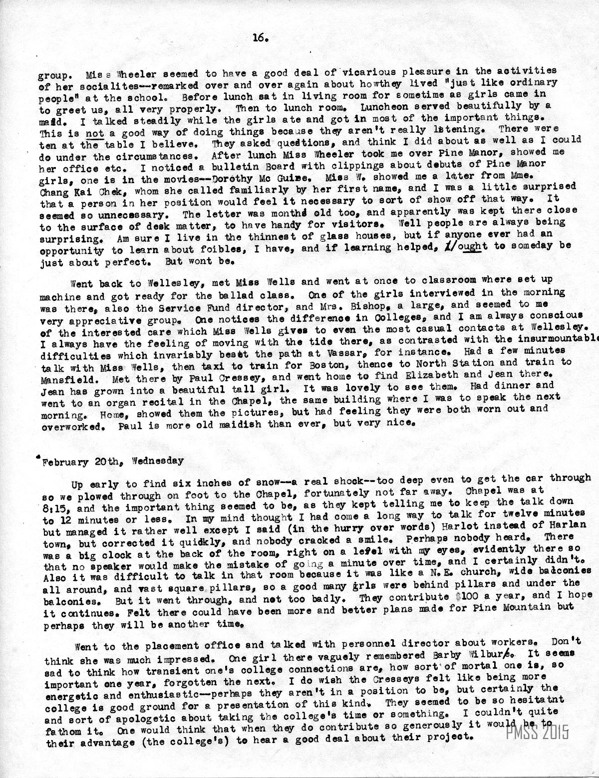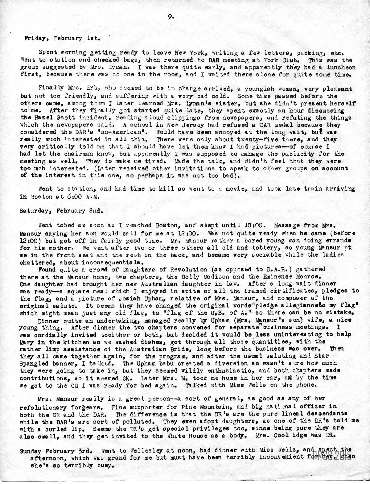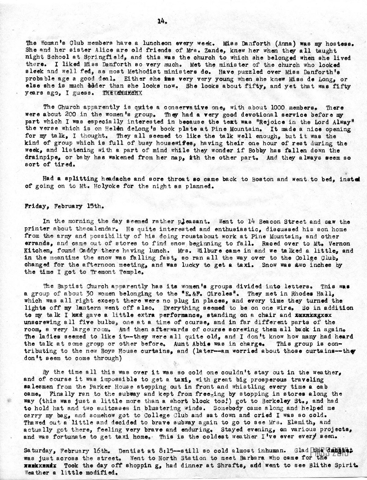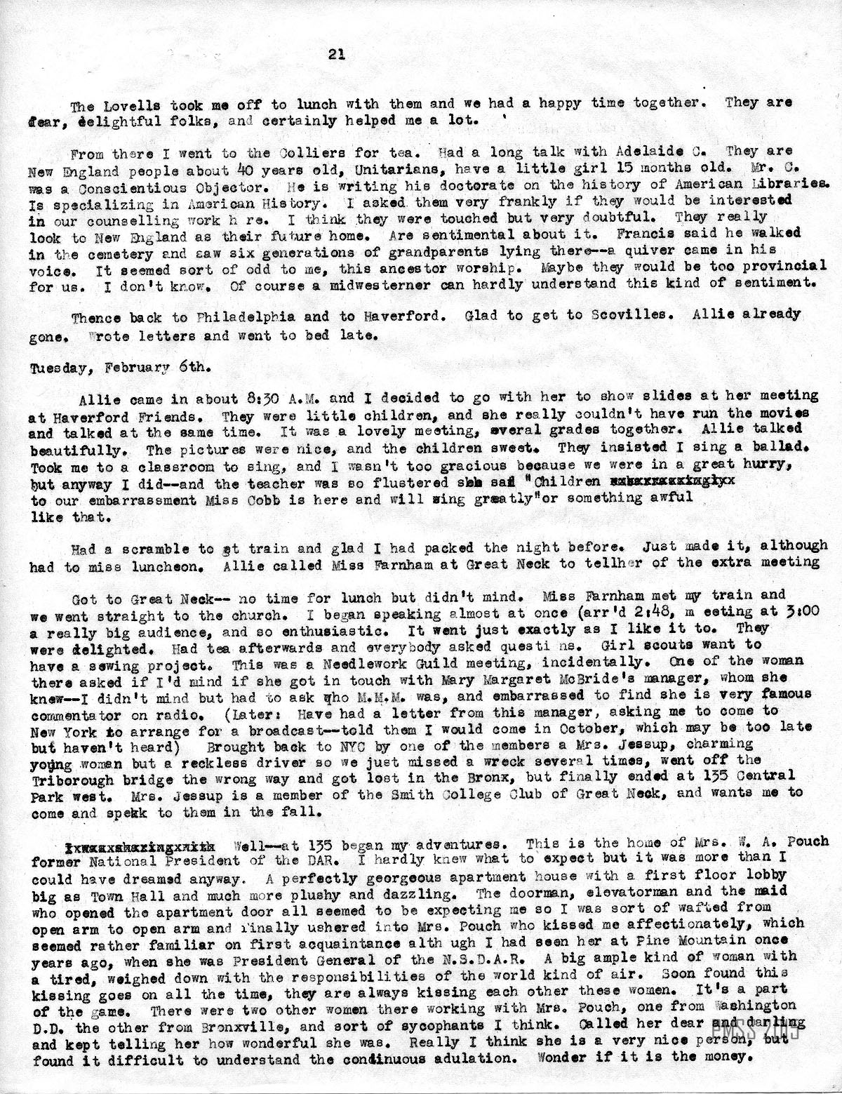 She starts her fundraising in the midst of the flu or a very bad cold in Asheville, NC, where she is re-connected with the new Luigi Zande family, formerly of Pine Mountain, and takes several days to recover from her illness. She is then on to Black Mountain College [Academy] where she finds the program and the students confounding. Then by train she travels to Moorestown, PA, on to New York City, NY, to Plainfield and Orange, NJ, and then to entertain the “Boston Brahmins.” Also in the Boston area she visits Wellesley College where former PMSS staff member, Evelyn K. Wells, is teaching and then on to S. Undley, Concord, and Poughkeepsie, NY. Her last stop is in More, PA (Westown), and then a return by train to Pine Mountain.