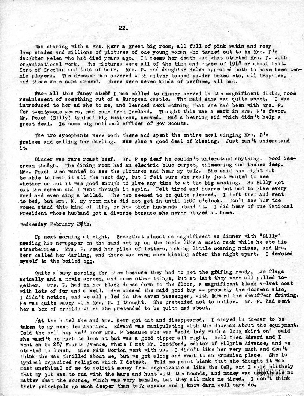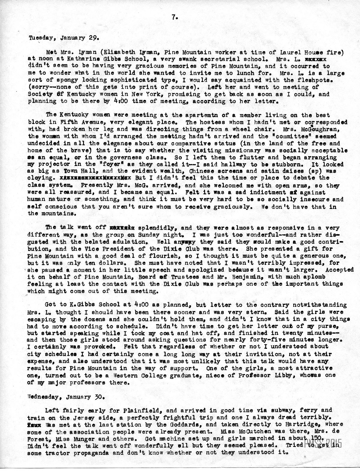 Met Mrs. Lyman [Elizabeth Lyman, Pine Mountain worker at time of Laurel House fire] at noon at Katherine Gibbs School, a very swank secretarial school. Mrs. L. didn’t seem to be having very gracious memories of Pine Mountain, and it occurred to me to wonder what in the world she wanted to invite me to lunch for…. Left her and went to meeting of Society of Kentucky Women in New York, promising to get back as soon as I could, and planning to be there by 4:00 time of meeting, according to her letter.