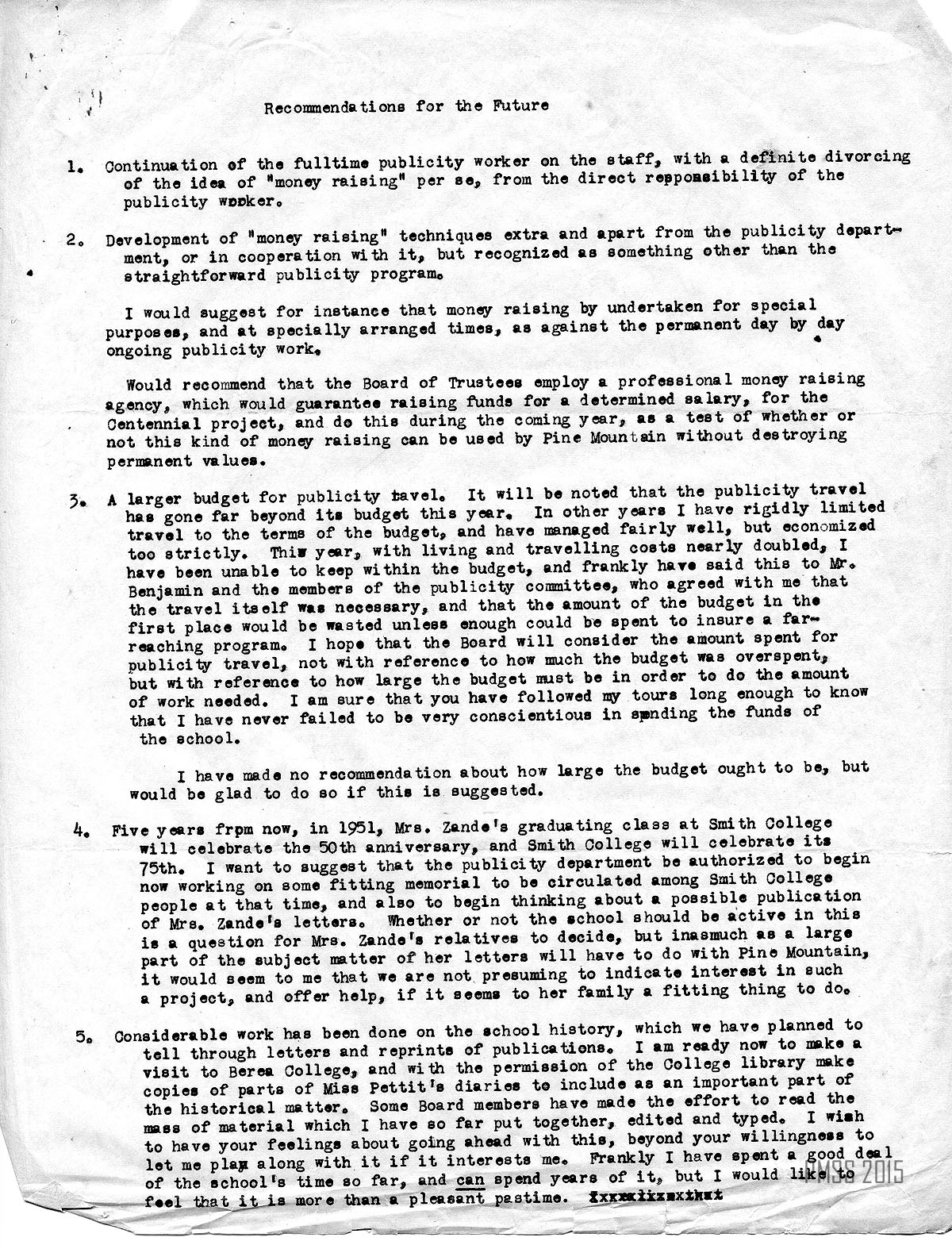 4. Five years from now, in 1951, Mrs. Zande’s graduating class at Smith College will celebrate the 50th anniversary, and Smith College will celebrate its 75th. I want to suggest that the publicity department be authorized to begin now working on some fitting memorial to be circulated among Smith College people at that time, and also to begin thinking about a possible publication of Mrs. Zande’s letters. Whether or not the school should be active in this is a question for Mrs. Zande’s relatives to decide, but inasmuch as a large part of the subject matter of her letters will have to do with Pine Mountain, it would seem to me that we are not presuming to indicate interest in such a project, and offer help, if it seems to her family a fitting thing to do.