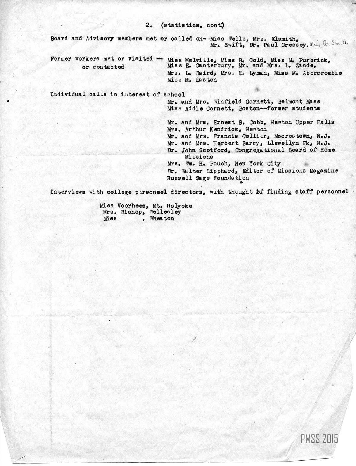 3. A larger budget for publicity travel. It will be noted that the publicity travel has gone far beyond its budget for this year. In other years I have rigidly limited travel to the terms of the budget, and have managed fairly well, but economized too strictly. This year, with living and traveling costs nearly doubled, I have been unable to keep within the budget, and frankly have said this to Mr. [H.R.S] Benjamin and the members of the publicity committee, who agreed with me that the travel itself was necessary, and that the amount of the budget in the first place would be wasted unless enough could be spent to insure a far-reaching program. I hope that the Board will consider the amount spent for publicity travel, not with reference to how much the budget was overspent, but with reference to how large the budget must be in order to do the amount of work needed. I am sure that you have followed my tours long enough to know that I have never failed to be very conscientious in spending the funds of the school.