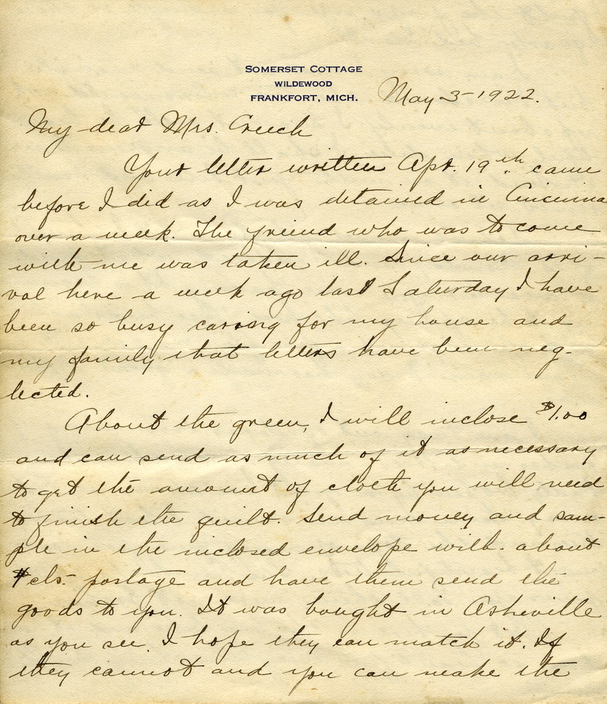 About the green, I will inclose (sic) $1.00 and can send as much of it as necessary to get the amount of cloth you will need to finish the quilt. Send money and sample in the inclosed envelope with about 4 cts. postage and have them send the goods to you. It was bought in Asheville as you see. I hope they can match it. If If they cannot and you can make the…