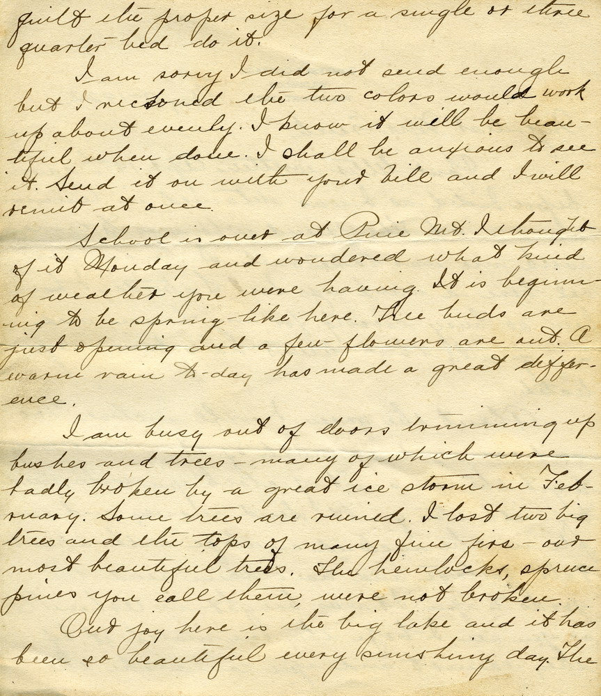 School is out at Pine Mt. I thought of it Monday and wondered what kind of weather you were having. It is beginning to be spring like here. The buds are just opening and a few flowers are out. A warm rain to-day has made a great difference.