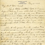 Letterhead on Anne Pavey‘s letter to Mrs. Creech displays her address in Frankfort, MI. She explains her delay in writing, then makes arrangements concerning a quilt that Mrs. Creech is sewing for her. She reminisces about Pine Mt., writes about the weather, her enjoyment of the lake, Miss Somerton’s health, and her dog. She mentions having Rebecca Margaret of Pine Mt. School for the summer and her hopes for her. She enjoyed the trip and Knoxville conference. She is glad to be a housekeeper now in her own home and doesn’t miss being a teacher or traveler; wishes Mrs. Creech could visit.