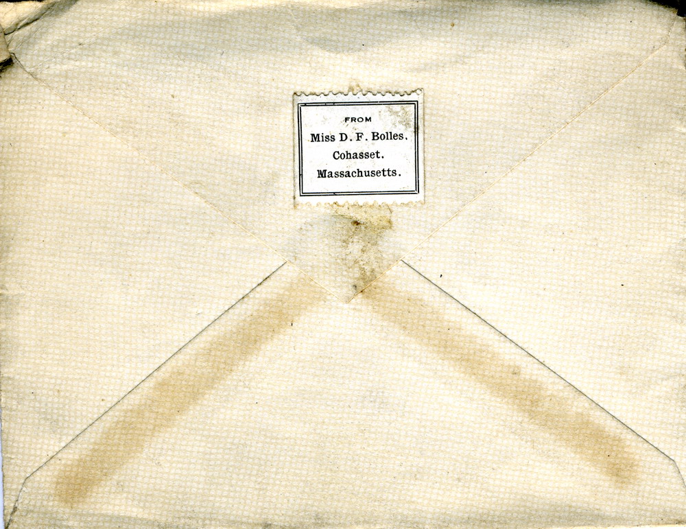 Reverse side of envelope with address sticker: “FROM Miss D.F. Bolles. Cohasset. Massachusetts.”