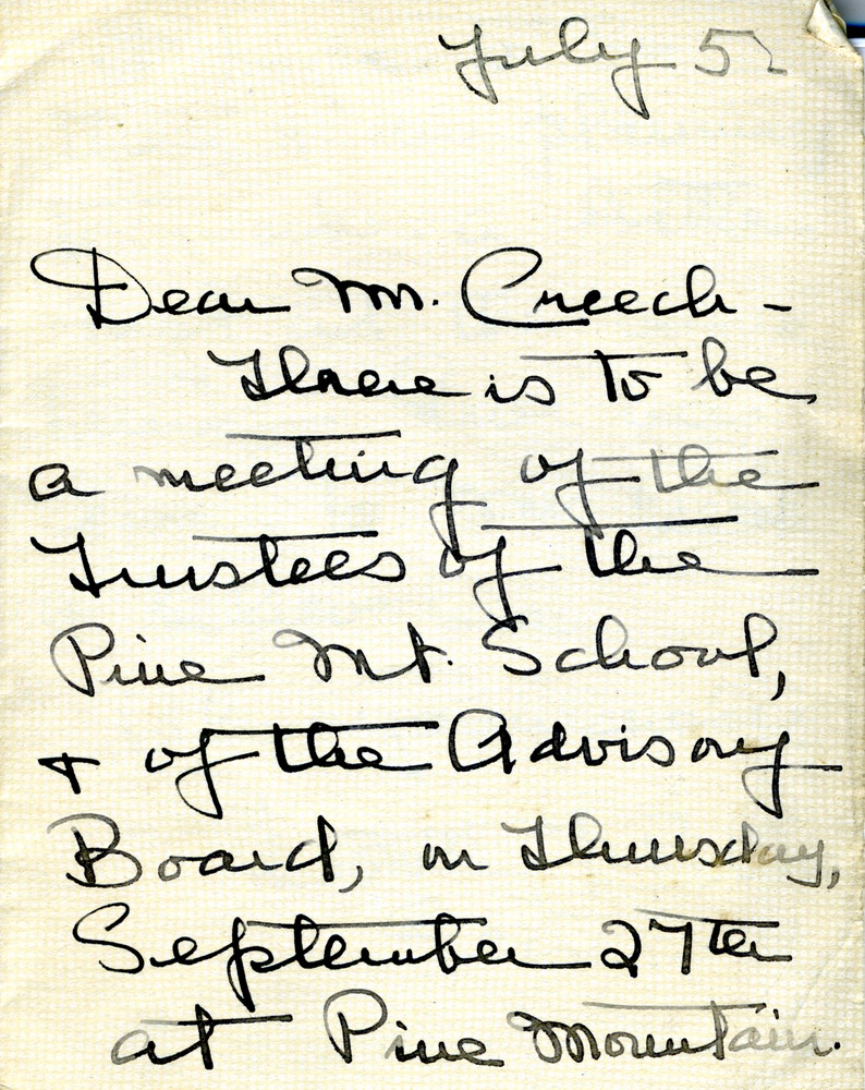 There is to be a meeting of the Trustees of the Pine Mt. School, & of the Advisory Board, on Thursday, September 27th at Pine Mountain.