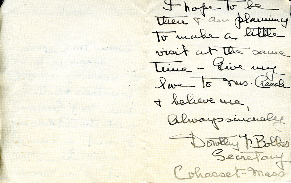 CONTENTS: July 9, 1934. Miss Dorothy F. Bolles to Henry Clay Creech. Miss Bolles, Board Secretary, writes from Cohasset, MA, to inform Mr. Creech of a September meeting of the PMSS Board of Trustees and Advisory Board.