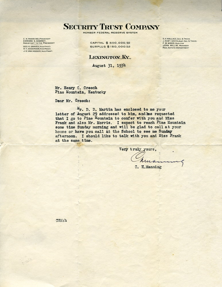 CONTENTS: August 31, 1934. C.N, Manning to Henry Clay Creech. Letterhead: “Security Trust Company, Lexington, Ky.” Mr. C.N. Manning informs Mr. Creech that D.D. Martin had forwarded Creech’s letter to him and asked that he meet with Creech, Miss Frank, and Glyn Morris.