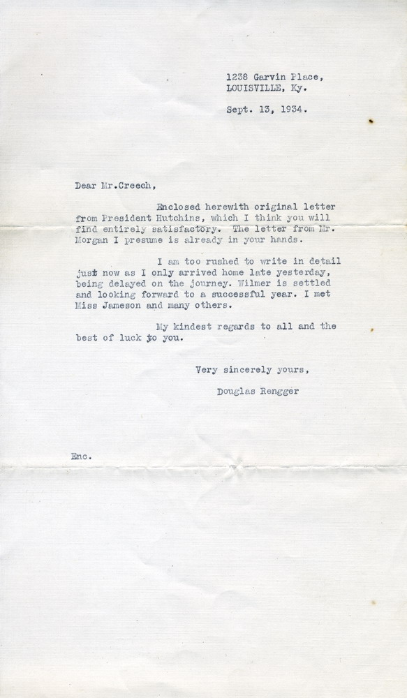 CONTENTS: Sept. 13, 1934. Douglas Rengger to Henry Clay Creech. D. Rengger of Louisville, KY, forwards Berea College President Hutchins’ letter to Mr. Creech, who should already have a letter from Mr. Morgan. He mentions Wilmer and Miss Jameson.