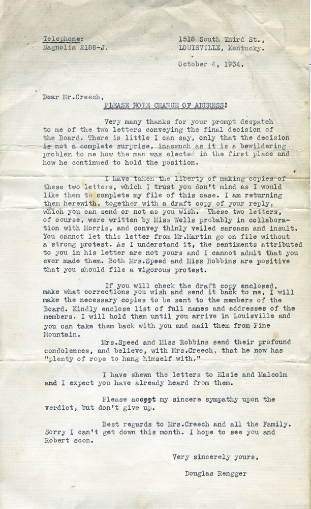CONTENTS: October 4, 1934. Douglas Rengger to Henry Clay Creech. D. Rengger writes to H.C. Creech from Louisville, KY, thanking Creech for sending him the two letters with the Board’s final decision. He comments on the two letters, written by Miss [Evelyn K.] Wells, probably in collaboration with Glyn Morris. He, along with Mrs. Speed and Miss Robbins, urge Creech to protest Mr. Martin’s letter. He mentions showing the letters to Elsie and Malcolm.