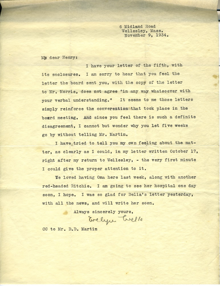 CONTENTS: November 9, 1934. Evelyn Wells to Henry Clay Creech. E. Wells in Wellesley, MA, responds to H.C.’s letter of November 5, expressing regret that Creech disagrees with the board’s letter. She wonders why it took Creech 5 weeks to tell Mr. Martin. In her October 17 letter, she tried to tell him of her opinion. She mentions seeing Oma and another Ritchie and receiving Delia’s letter.