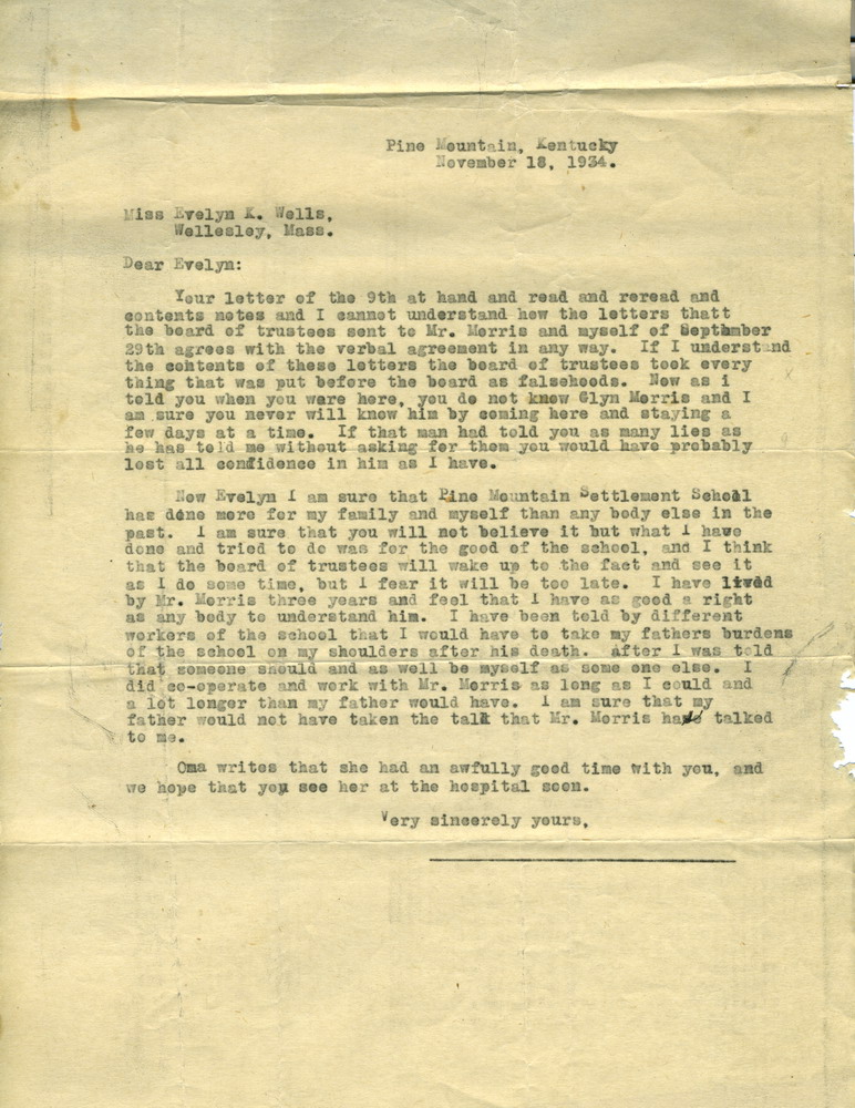 Now Evelyn I am sure that Pine Mountain Settlement School has done more for my family and myself than any body else in the past. I am sure that you will not believe it but what I have done and tried to do was for the good of the school, and I think that the board of trustees will wake up to the fact and see it as I do some time, but I fear it will be too late. I have lived by Mr. Morris three years and feel that I have as good a right as anybody to understand him. I have been told by different workers of the school that I would have to take my father’s burdens of the school on my shoulders after his death. After I was told that someone should and as well be myself as some one else. I did co-operate and work with Mr. Morris as long as I could and a lot longer than my father would have. I am sure that my father would not have taken the talk that Mr. Morris has talked to me.