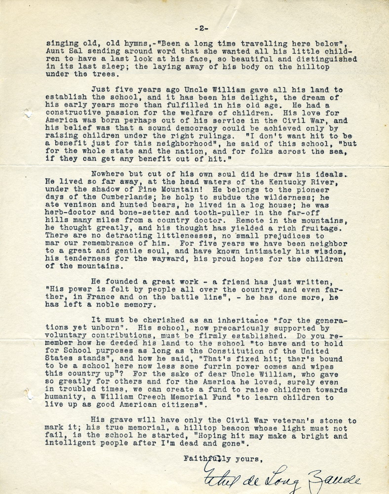 It must be cherished as an inheritance “for the generations yet unborn.” His school, now precariously supported by voluntary contributions, must be firmly established. Do you remember how he deeded his land to the school “to have and to hold for School purposes as long as the Constitution of the United States stands,” and how he said “That’s fixed hit; thar’s bound to be a school here now less some furrin power comes and wipes this country up”? For the sake of dear Uncle William, who gave so greatly for others and for the America he loved, surely even in troubled times, we can create a fund to raise children towards humanity, a William Creech Memorial Fund “to learn children to live up as good American citizens.”