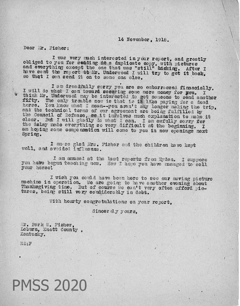 [074] November 14, 1918. To Fisher, Leburn, KY, from EZ (Zande), remarking on her copy of his report with pictures. Regrets his financial situation and will try to find money for him. Zande supposes Fisher has begun teaching now. Mentions enjoying a moving picture machine at PMSS.