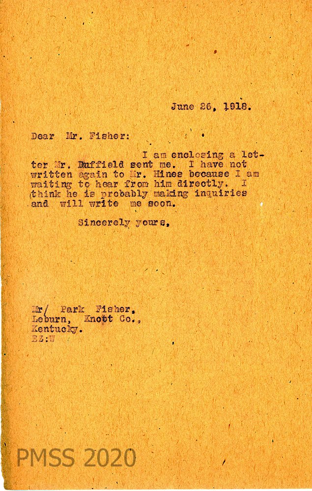 [043] June 29, 1918. To Fisher from [unsigned, apparently Zande] who encloses Hines’s June 27th letter. Duffield has been asked to a meeting at Big Laurel or Dillon. “When the appropriate is finally made, I know my friends in Chicago will be able to do something more.”