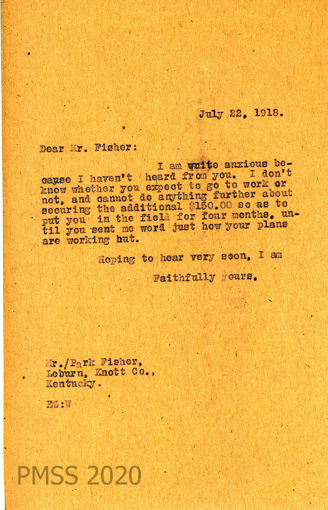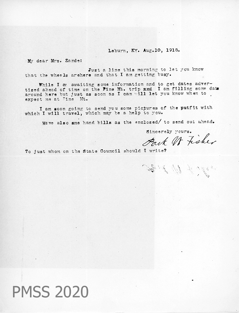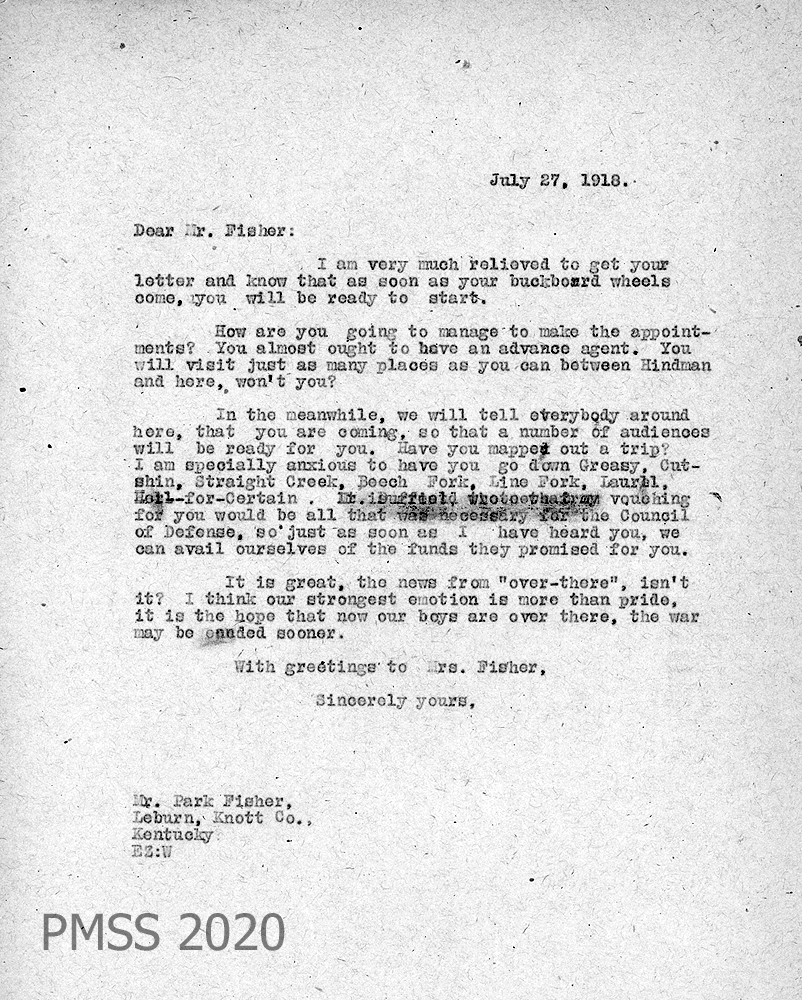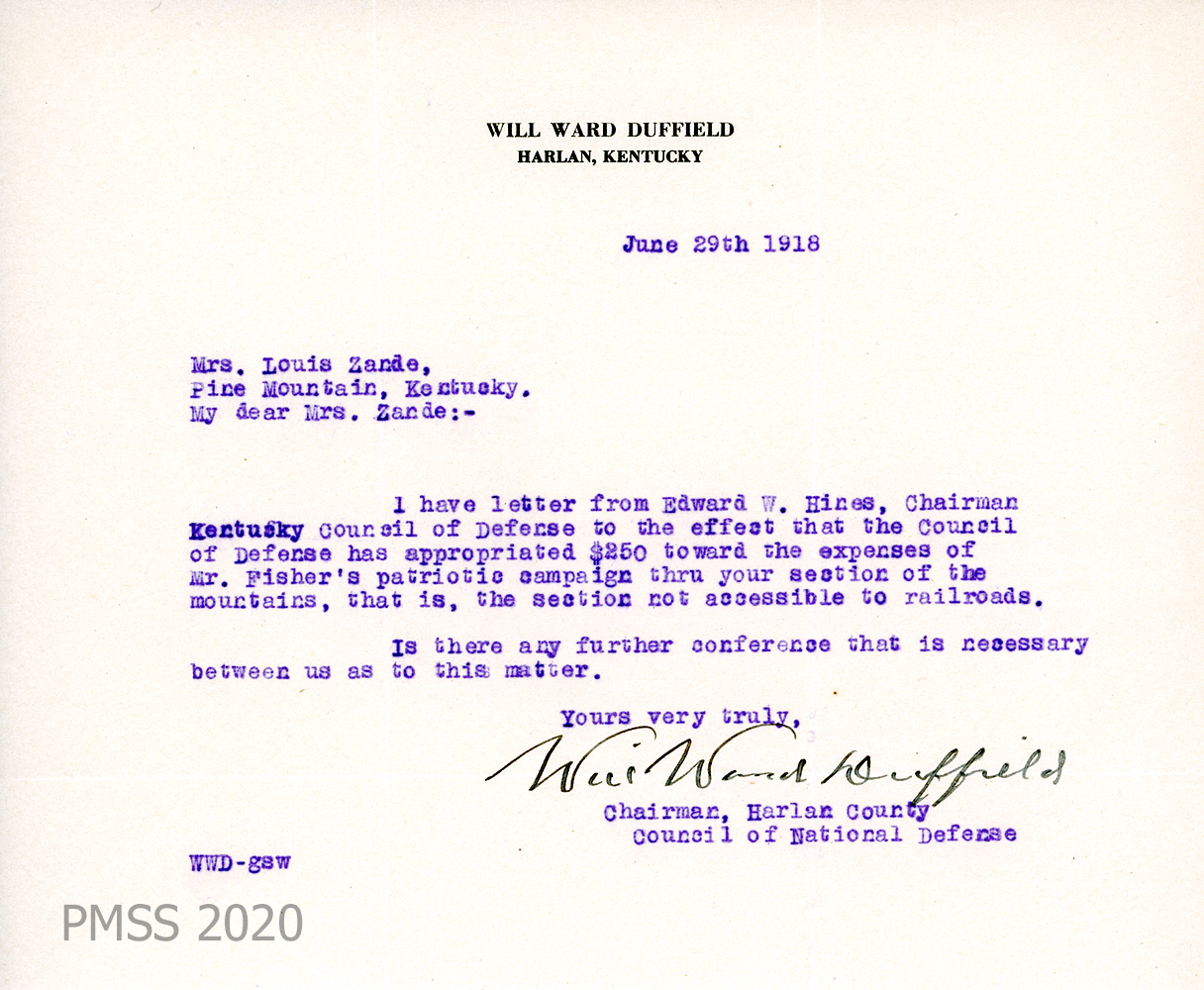 [040] June 19, 1918. To Duffield from EZ (Zande), providing information about Fisher: “Mr. Park Fisher from Demarest, Georgia. He is a cripple, who was the manual training teacher at Hindman when I went there as a principal eight years ago. He then started religious work very much needed, in Knott County…a good speaker, a sincere patriot ….very well adapted for a campaign of patriotic education in the mountains because his vocabulary and manner and so on are simple….” Describes her fundraising for five months; being misled by the Kentucky Council of Defense that they would appropriate $100 a month. “I want him to make an intensive trip through the sections of the mountains that are off the railroad.”