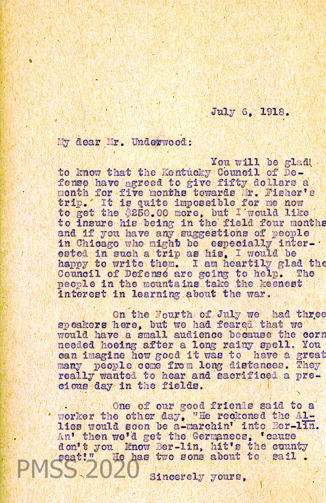 [049] July 4, 1918. To Underwood from [unsigned, apparently Zande], who reports Kentucky Council of Defense’s appropriation and asks for his suggestions of Chicago people who may be interested in the project. Tells of 3 speakers at PMSS on July 4th that attracted a large and appreciative audience.