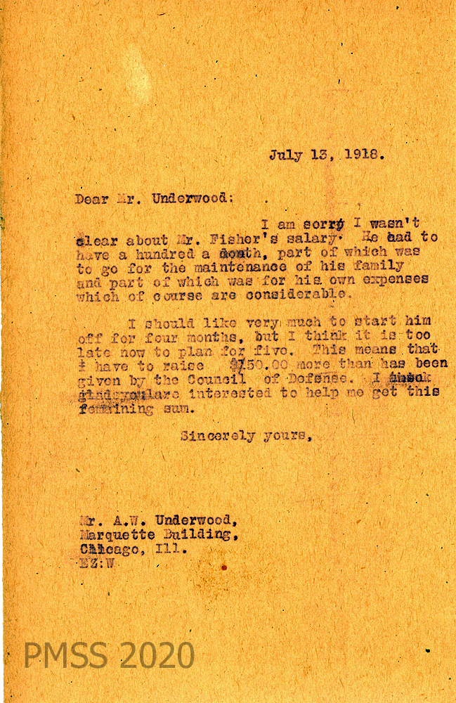 [051] July 13, 1918. To Underwood from Zande, who explains Fisher’s salary needs. He needs $100 a month for his family and his work. The Council of Defence will pay $50 a month for five months. She must shorten their plans to four months and would like to raise $150 more.