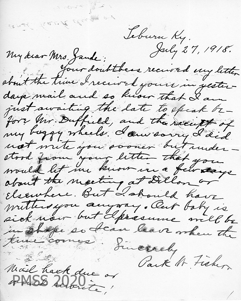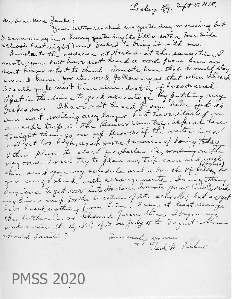 [063] September 5, 1918. Handwritten letter to Zande from Fisher, Lackey, KY, who has written to Beckley. There has been no response, so he’s started out for a week in the Beaver country. He will send Zande his plans and posters. He began his lecturing on July 15.