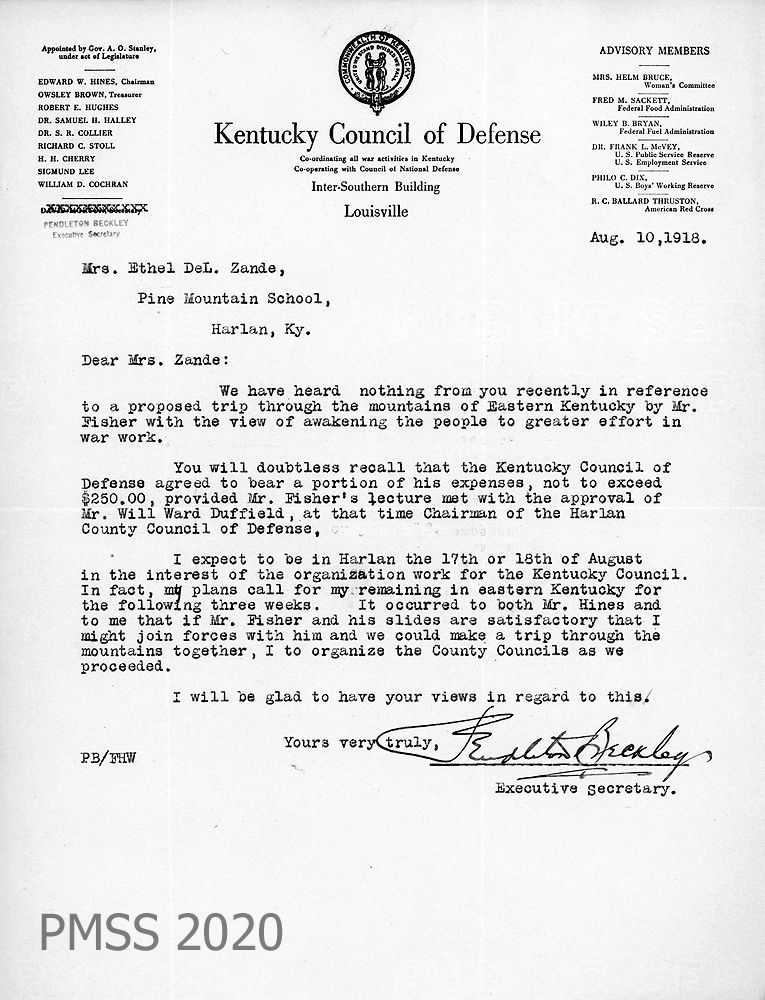 [058] August 10, 1918. To Zande from Pendleton Beckley, Executive Secretary, Kentucky Council of Defense, Louisville, KY who will be in eastern Kentucky for three weeks and suggests that he could join Fisher on his trips through the mountains and Beckley could organize the County Councils as they proceed.