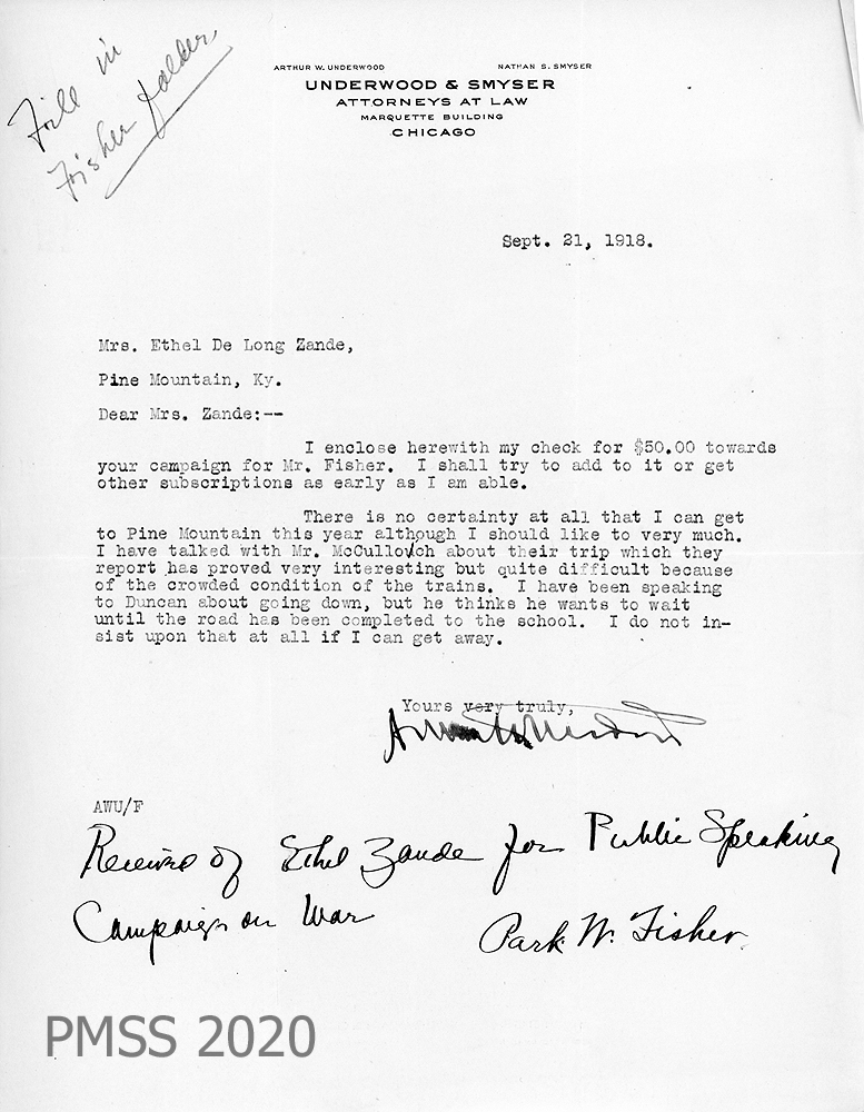 [066] September 21, 1918. To Zande from Underwood, sending his $50 check for Fisher’s campaign; he wishes to visit PMSS.