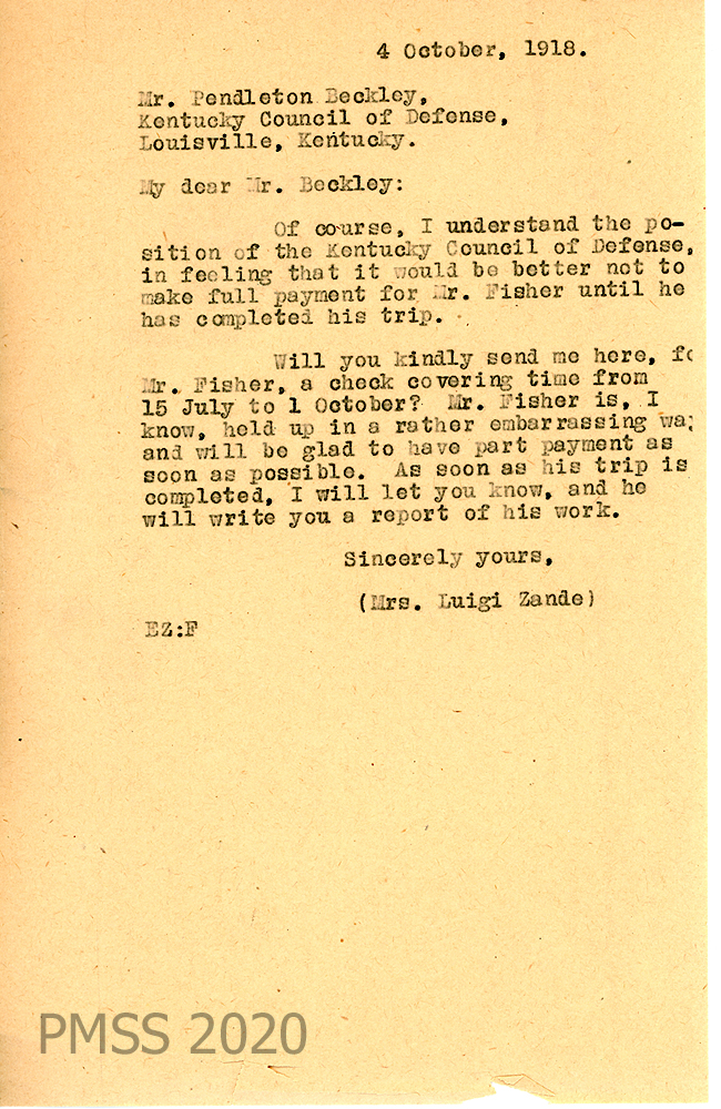 [069] September 28, 1918. To Zande from Beckley, who had received a letter from Hines with a copy of Fisher’s program and a photo of “his outfit.” The Council would be very glad to have a report from Fisher about his work and its effect. The Executive Committee of the Council has declined Zande’s request for a full amount of the funds before they are earned.