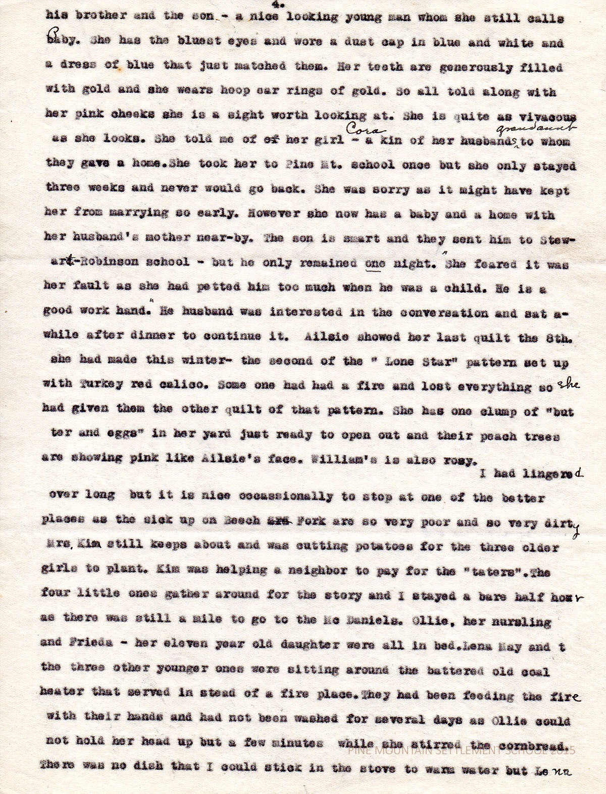 Mary is not expecting callers. She is helping Henry put up some new palings on top of a rock wall he has made quite neatly to keep the tiny yard from washing down and filling the narrow roadway. I’ll go in while you talk with Henry, and see the baby Lilian. She is so covered up in the bed I can hardly find her and caution Mary about covering her face so closely. Mary has a small bench on which two can sit so she draws it up to the wood fire on the hearth. She has begun to tear off the old paper that had covered ceiling and walls – several layers of Sears and Roebuck Co’s catalogues. She regrets the rough floor and so do I. It seems as tho their parents could have helped them to refloor it – the tiny porch has no floor. We talk of this and that. She has put in some ‘forard” cabbage plants – frost proof – some onions and “taters”. They have a poke of meal and a piece of meat from her mother Sara Jane and some potatoes. She doesn’t complain of anything. They were urged to wait a while before getting married. I saw henry the day they moved, enticing two shoats with a few grains of corn to follow him to the little pen in the yard. Later they will be let out to forage for themselves. The kitchen has an old stove they picked up somewhere and a table that Henry made from some boards Mary’s father tore out of the show cases of a store he once had in part of which building Viola now lives. I suggested he come to the Cabin for some short boards with which he could make a cupboard for the few dishes. But they can stand on the table until he gets his ground ready for the corn crop. His father has rented them some six steep and stony acres. They will have workings – that is changing work with their kin folks – so no money will be needed for labor. You have been intrigued with Henry’s blue eyes and rosy complexion I am sure. One day when the baby was very tiny and crying I would not allow any one to pick her up. As Henry came thru the room I said, “Here comes Henry. He wants to nuss the baby too”. He blushingly said “and I will too if she doesn’t hesh”. Of course she stopped shortly.