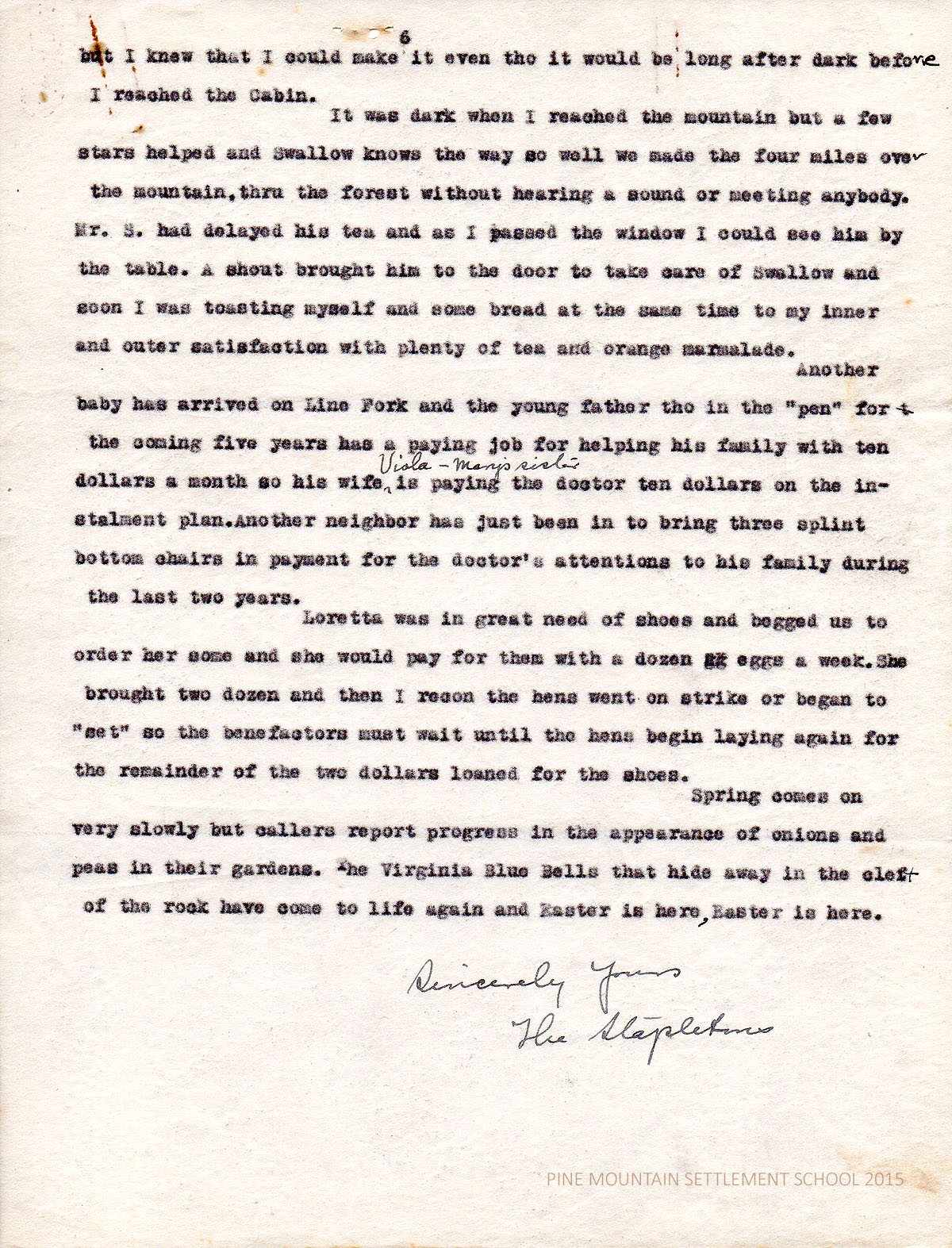 Another baby has arrived on Line Fork and the young father tho in the “pen” for the coming five years has a paying job for helping his family with ten dollars a month so his wife Viola – Mary’s sister – is paying the doctor ten dollars on the instalment plan. Another neighbor has just been in to bring three splint bottom chairs in payment for the doctor’s attentions to his family during the last two years.