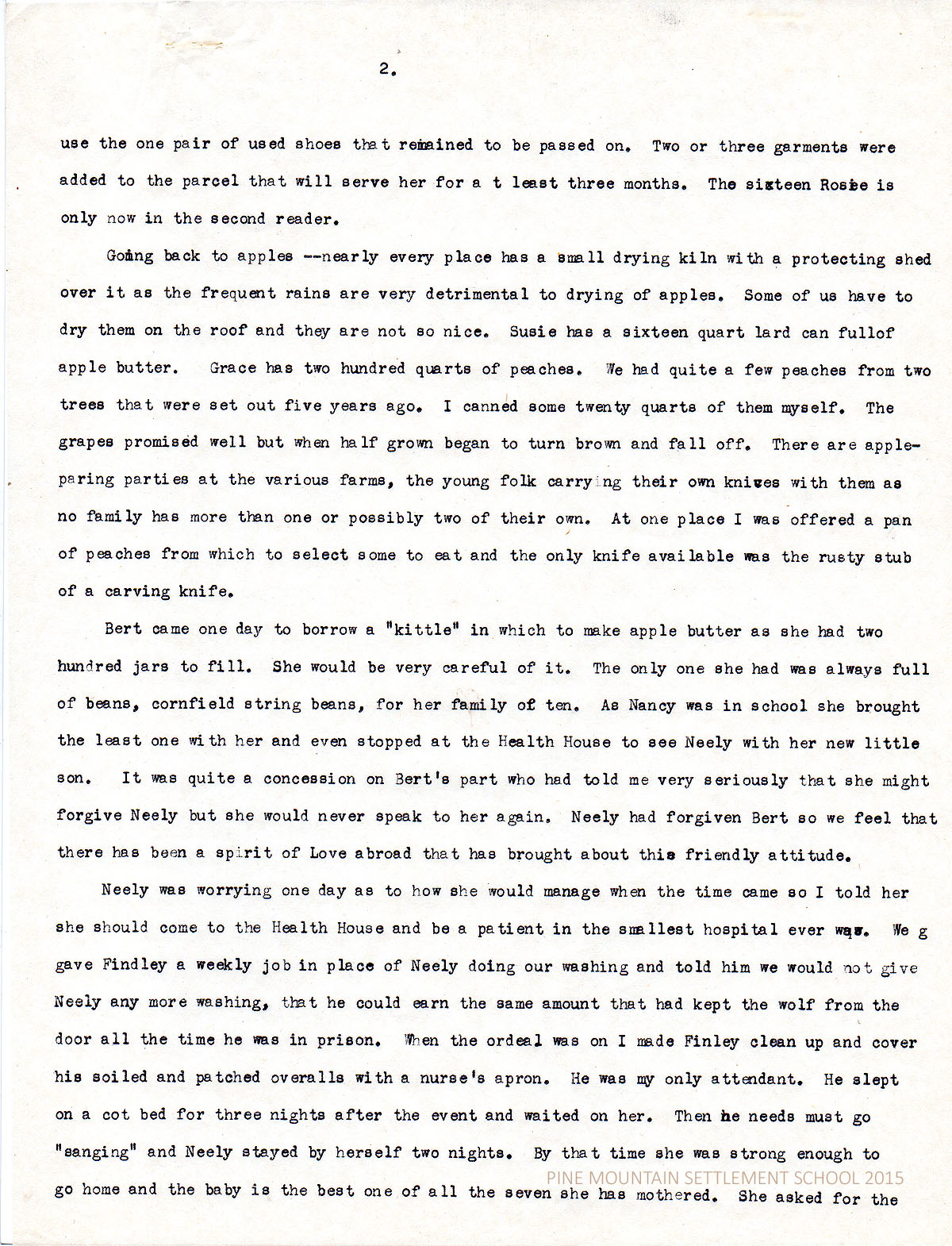 Bert came one day to borrow a “kittle” in which to make apple butter as she had two hundred jars to fill. She would be very careful of it. The only one she had was always full of beans, cornfield string beans, for her family of ten. As Nancy was in school she brought the least one with her and even stopped at the Health House to see Neely with her new little son. It was quite a concession on Bert’s part who had told me very seriously that she might forgive Neely but she would never speak to her again. Neely had forgiven Bert so we feel that there has been a spirit of Love abroad that has brought about this friendly attitude.