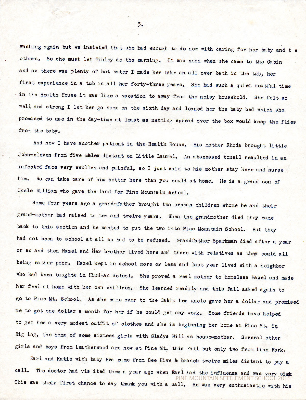 And now I have another patient in the Health House. His mother Rhoda brought little John – eleven from five miles distant on Little Laurel. An abscessed tonsil resulted in an infected face very swollen and painful, so I just said to his mother stay here and nurse him. We can take care of him better here than you could at home. He is a grandson of Uncle William who gave the land for Pine Mountain school.