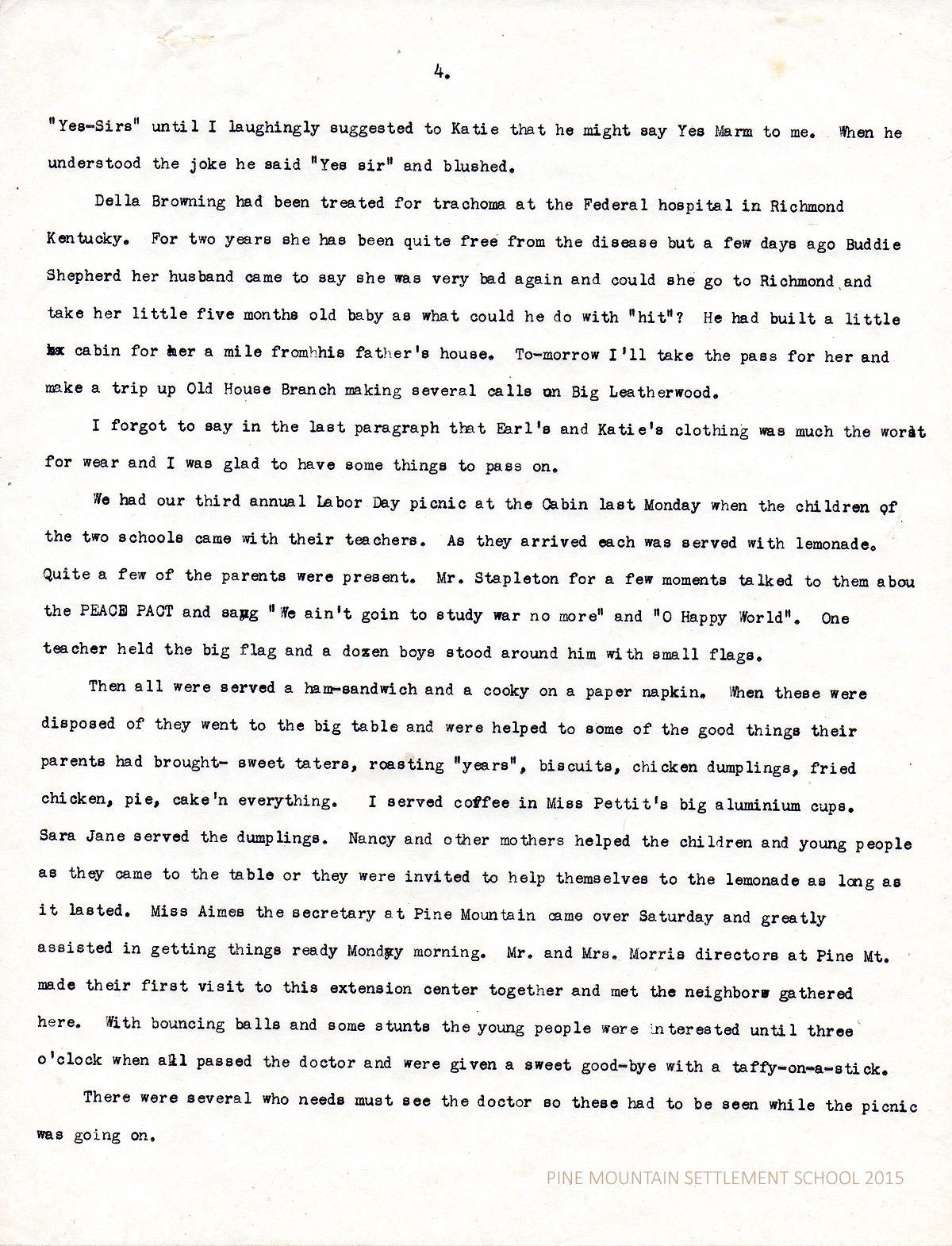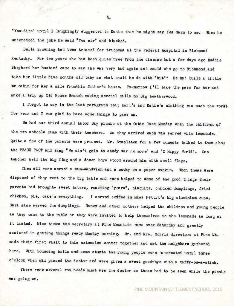 Then all were served a ham-sandwich and a cooky on a paper napkin. When these were disposed of they went to the big table and were helped to some of the good things their parents had brought – sweet taters, roasting “years”, biscuits, chicken dumplings, fried chicken, pie, cake’n everything. I served coffee in Miss Pettit’s big aluminum cups. Sara Jane served the dumplings. Nancy and other mothers helped the children and young people as they came to the table or they were invited to help themselves to the lemonade as long as it lasted. Miss Aimes the secretary at Pine Mountain came over on Saturday and greatly assisted in getting things ready Monday morning. Mr and Mrs Morris directors at Pine Mt made their first visit to this extension center together and met the neighbors gathered here. With bouncing balls and some stunts the young people were interested until three o’clock when all passed the doctor and were given a sweet good-bye with taffy-on-a-stick.