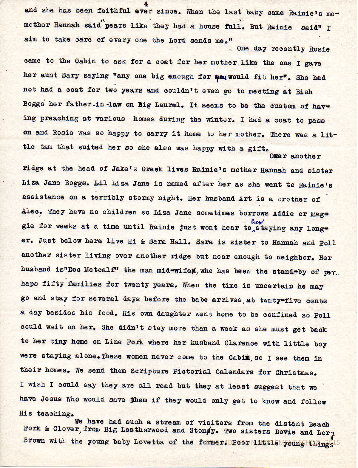 Over another ridge at the head of Jake’s Creek lives Rainie’s mother Hannah and sister Liza Jane Boggs. Lil Liza Jane is named after her as she went to Rainie’s assistance on a terribly stormy night. Her husband Art is a brother of Alec. They have no children so Liza Jane sometimes borrows Addie or Maggie for weeks at a time until Rainie just won’t hear to her staying any longer. Just below here live Hi & Sara Hall. Sara is sister to Hannah and Poll another sister living over another ridge but near enough to neighbor. Her husband is “Doc Metcalf” the man midwife, who has been the stand-by of perhaps fifty families for twenty years. When the time is uncertain he may go and stay for several days before the babe arrives, at twenty-five cents a day besides his food. His own daughter went home to be confined so Poll could wait on her. She didn’t stay more than a week as she must get back to her tiny home on Line Fork where her husband Clarence with little boy were staying alone. These women never come to the Cabin, so I see them in their homes. We send them Scripture Pictorial Calendars for Christmas. I wish I could say they are all read but they at least suggest that we have Jesus Who would save them if they would only get to know and follow His teaching.