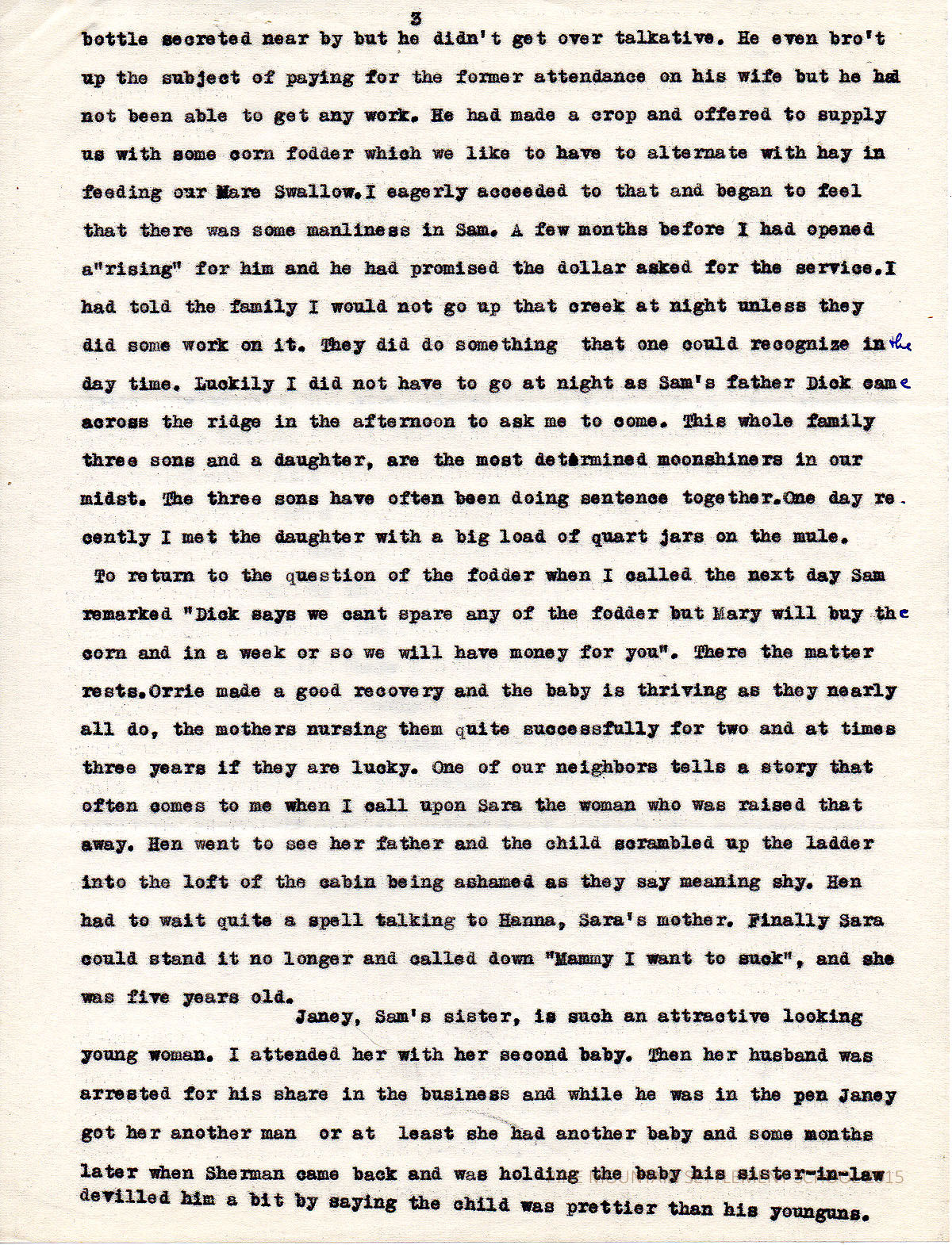 In the meantime the party was continuing and finally got to the stage where the children were hustled off to grandmother’s and Sam called Mary to hurry. She was feeding the stock. Before long another little son was born. Vine appeared again just that moment. Little Verdi, the oldest, had the privilege of naming the baby had it been another girl but she was quite unwilling to choose a name for a boy. As she is a real helper with the young’uns when baby was dressed in his pretty little outing gowns he was put in her arms a few minutes so that she could say she had nussed him first. Sam decided his name should be Basil as his brother had named his son born two days before Basle. Sam was really very attentive, bringing water or going a dozen times to see where the young’uns were when Orrie told him to. Sometimes I suspected he went out to fortify himself with a nip from a bottle secreted near by but he didn’t get over talkative. He even bro’t up the subject of paying for the former attendance on his wife but he had not been able to get any work. He had made a crop and offered to supply with some corn fodder which we like to have alternate with hay in feeding our Mare Swallow. I eagerly acceded to that and began to feel that there was some manliness in Sam. A few months before I had opened a “rising” for him and he had promised the dollar asked for the service. I had told the family I would not go up that creek at night unless they did some work on it. They did do something that one could recognize in the day time. Luckily I did not have to go at night as Sam’s father Dick came across the ridge in the afternoon to ask me to come. This whole family three sons and a daughter, are the most determined moonshiners in our midst. The three sons have often been doing sentence together. One day recently I met the daughter with a big load of quart jars on the mule.