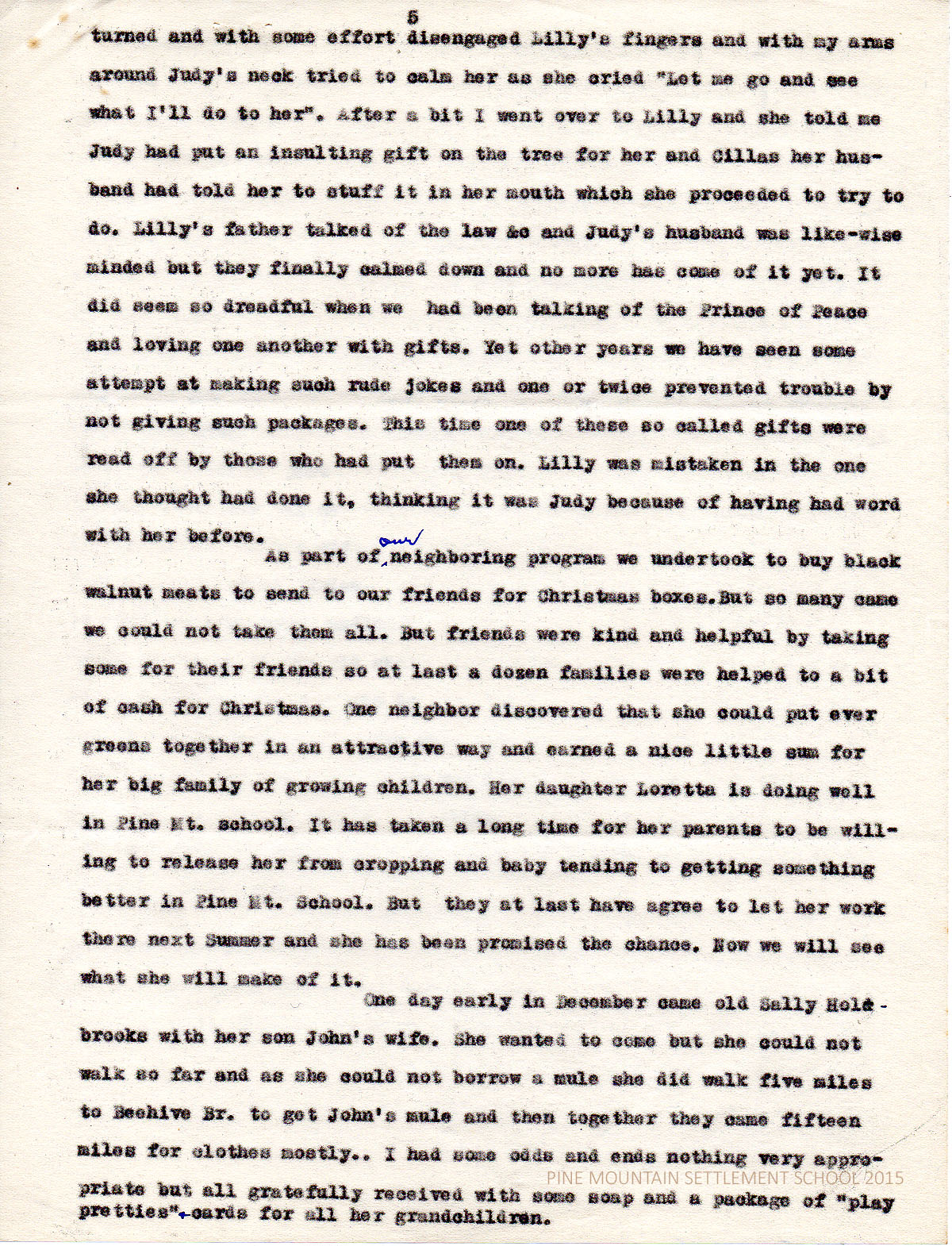 As part of our neighboring program we undertook to buy black walnut meats to send to our friends for Christmas boxes. But so many came we could not take them all. But friends were kind and helpful by taking some for their friends so at last a dozen families were helped to a bit of cash for Christmas. One neighbor discovered that she could put evergreens together in an attractive way and earned a nice little sum for her big family of growing children. Her daughter Loretta is doing well in Pine Mt school. It has taken a long time for her parents to be willing to release her from cropping and baby tending to getting something better in Pine Mt School. But they at last have agreed to let her work there next Summer and she has been promised the chance. Now we will see what she will make of it.