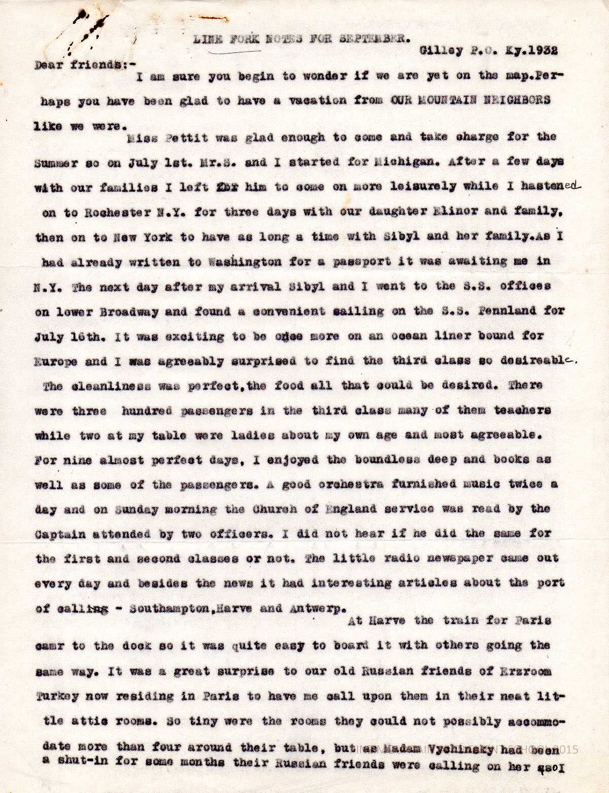 TAGS: Dr. Ida S. Stapleton,Line Fork Medical Settlement report,Katherine Pettit,sailing on ocean liner to Europe,European tour,weaving,stories about people in the community,Labor Day picnic, funeralizing,preaching at Regular Baptist Church,Dr. Kenneth Gould
