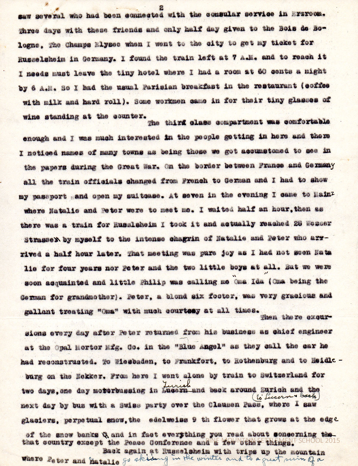 Then there [were] excursions every day after Peter returned from his business as chief engineer at the Opal (sic) Motor Mfg Co in the “Blue Angel” as they call the car he had reconstructed. To Wiesbaden, to Frankfort (sic), to Rothenberg and to Heidelberg on the Nekker [Neckar River]. From here I went alone by train to Switzerland for two days, one day motorbussing around Zurich and the next day by bus with a Swiss party over the Clausen Pass to Lucerne and back, where I saw glaciers, perpetual snow, the edelweiss flower that grows at the edge of the snow banks and in fact everything you read about concerning that country except the Peace Conference and a few other things.