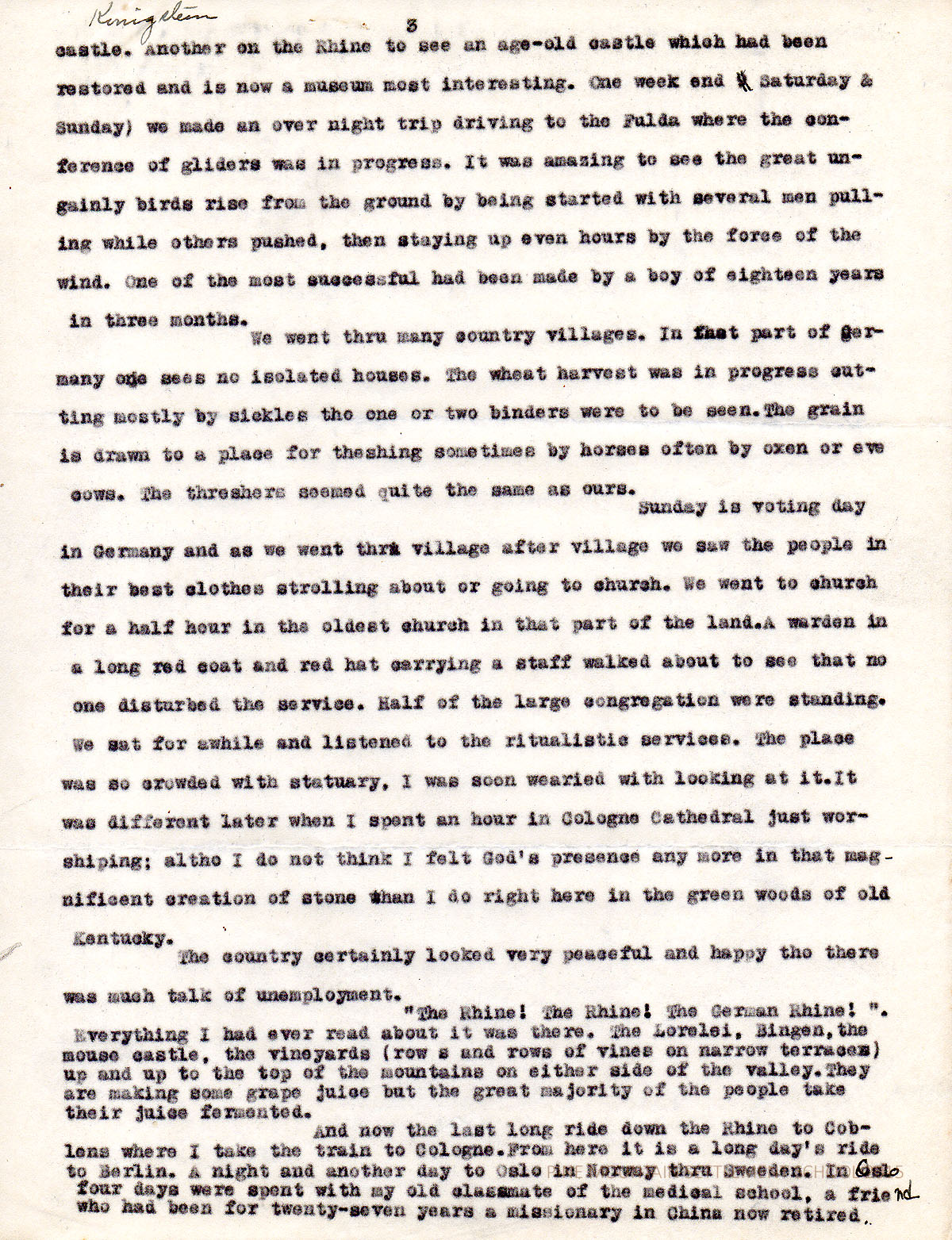 Sunday is voting day in Germany and as we went thru village after village we saw the people in their best clothes strolling about or going to church. We went to church for half an hour in the oldest church in that part of the land. A warden in a long red coat and red hat carrying a staff walked about to see that no one disturbed the service. Half of the large congregation were standing. We sat for awhile and listened to the ritualistic services. The place was so crowded with statuary, I was soon wearied with looking at it. It was different later when I spent an hour in Cologne Cathedral just worshiping; altho I do not think I felt God’s presence any more in that magnificent creation of stone than I do right here in the green woods of old Kentucky.
