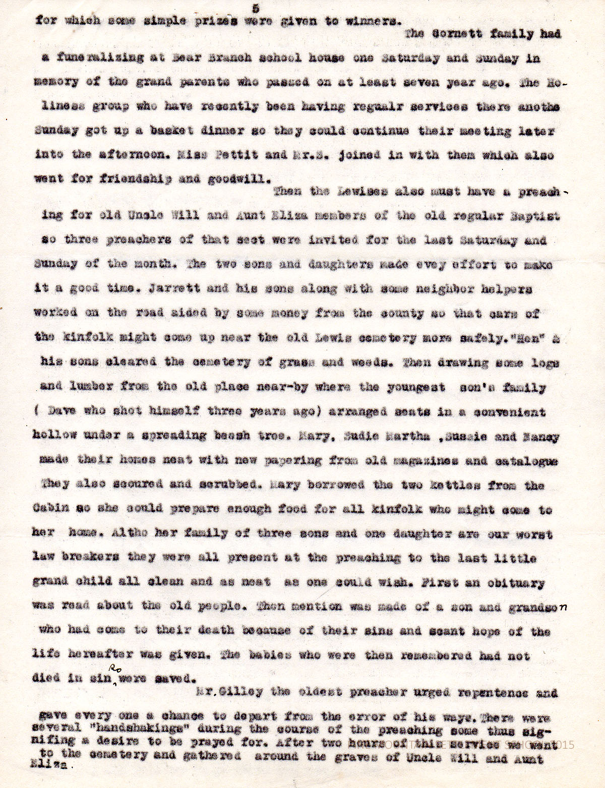 Then the Lewises also must have a preaching for old Uncle Will and Aunt Eliza members of the old regular Baptist so three preachers of that sect were invited for the last Saturday and Sunday of the month. The two sons and daughters made every effort to make it a good time. Jarrett and his sons along with some neighbor helpers worked on the road aided by some money from the county so that cars of the kinfolk might come up near the old Lewis cemetery more safely. “Hen” & his sons cleared the cemetery of grass and weeds. Then drawing some logs and lumber from the old place near-by where the youngest son’s family (Dave who shot himself three years ago) arranged seats in a convenient hollow under a spreading beech tree. Mary, Sudie, Martha, Susie and Nancy made their homes neat with new papering from old magazines and catalogues. They also scoured and scrubbed. Mary borrowed the two kettles from the Cabin so she could prepare enough food for all kinfolk who might come to her home. Altho her family of three sons and one daughter are our worst law breakers they were all present at the preaching to the last little grandchild all clean and as neat as one could wish. First an obituary was read about the old people. Then mention was made of a son and grandson who had come to their death because of their sins and scant hope of the life hereafter was given. The babies who were then remembered had not died in sin, so were saved.