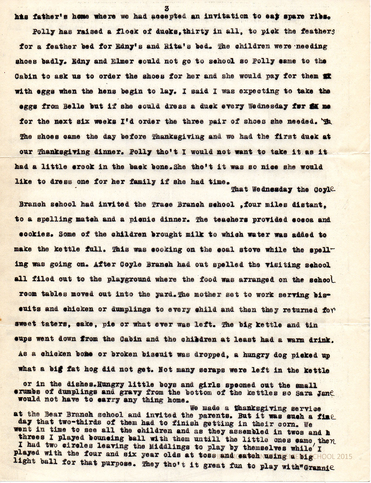 That Wednesday the Coyle Branch school had invited the Trace Branch school, four miles distant, to a spelling match and a picnic dinner. The teachers provided cocoa and cookies. Some of the children brought milk to which water was added to make the kettle full. This was cooking on the coal stove while the spelling was going on. After Coyle Branch had out spelled the visiting school all filed out to the playground where the food was arranged on the school room tables moved out into the yard. The mothers set to work serving biscuits and chicken or dumplings to every child and then they returned for sweet taters, cake, pie or whatever was left. The big kettle and tin cups went down from the Cabin and the children at least had a warm drink. As a chicken bone or broken biscuit was dropped, a hungry dog picked up what a big fat hog did not get. Not many scraps were left in the kettle or in the dishes. Hungry little boys and girls spooned out the small crumbs of dumplings and gravy from the bottom of the kettles so Sara Jane would not have to carry anything home.